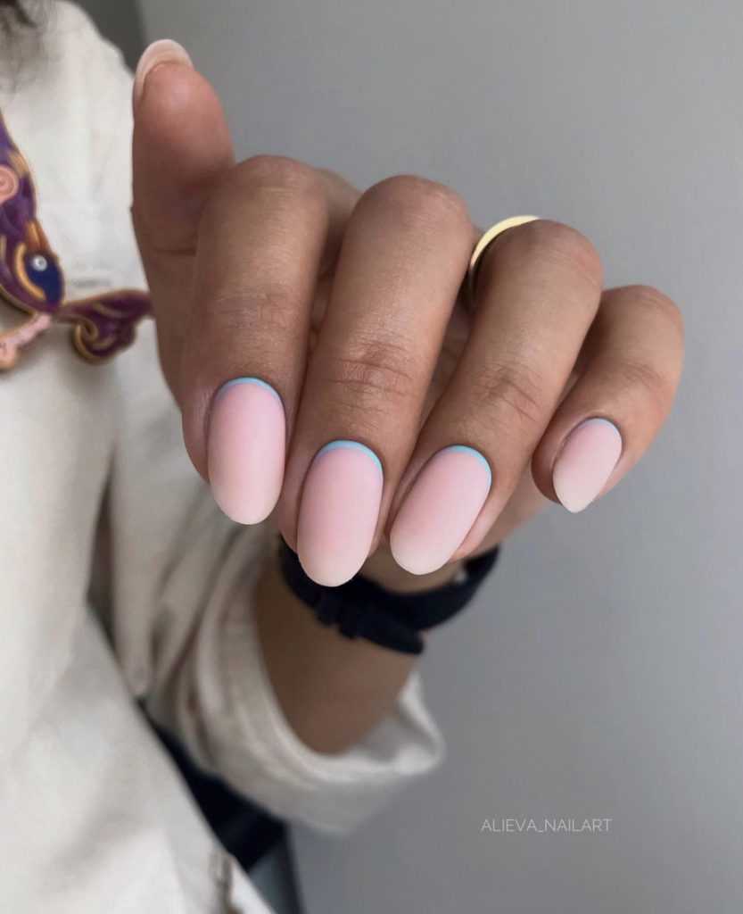 Бежевый маникюр хорошо смотрится с добавлением голубого лака. Дизайн ногтей с уголками делается с использованием трафарета такой формы, а омбре с помощью спонжа.