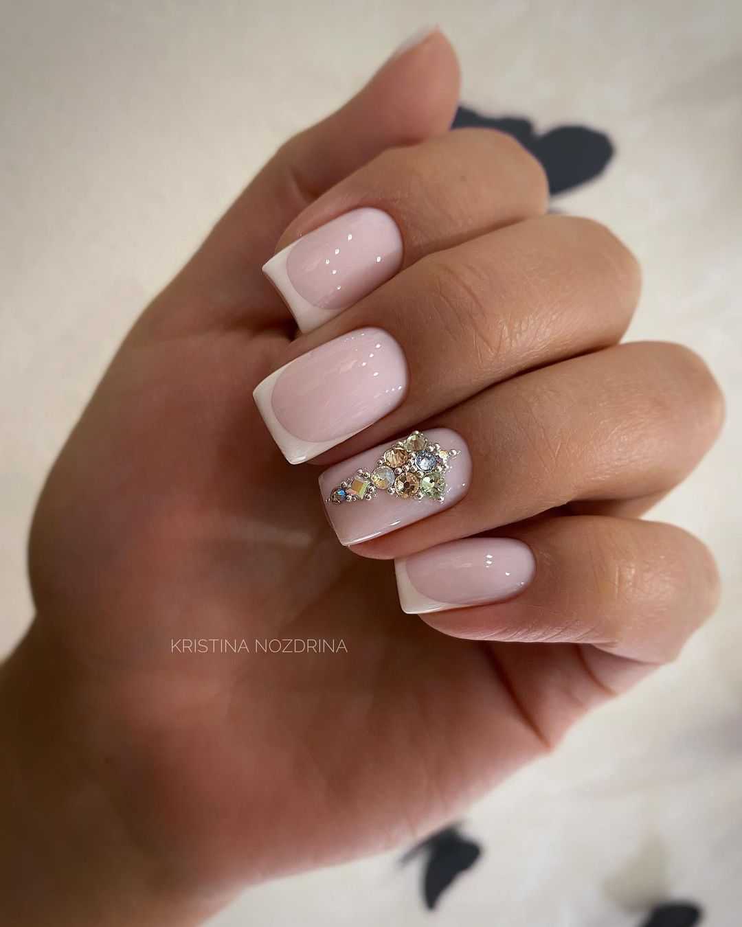 В идеале следует использовать одну красивую стразу на базовом бежевом покрытии. Стразы можно располагать следующим образом: