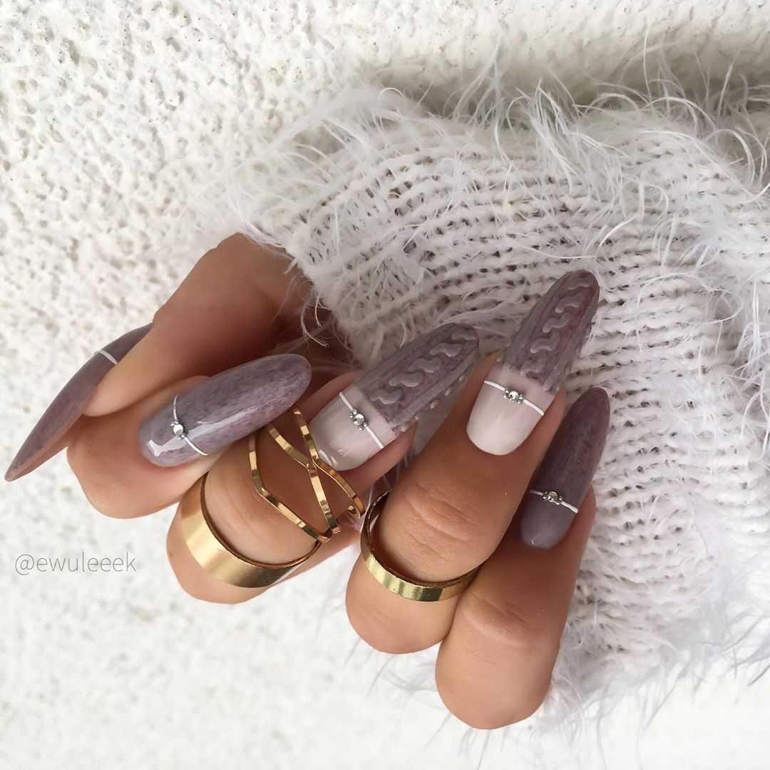 Особенно гармонично такой маникюр будет смотреться холодной осенью или зимой. На бежевом тоне можно изобразить коричневый узор, имитирующий крупную вязку. Сверху декорировать узор специальной акриловой пудрой. Поверхность ногтя приобретет бархатную приятную текстуру и придаст объема коричневому рисунку.