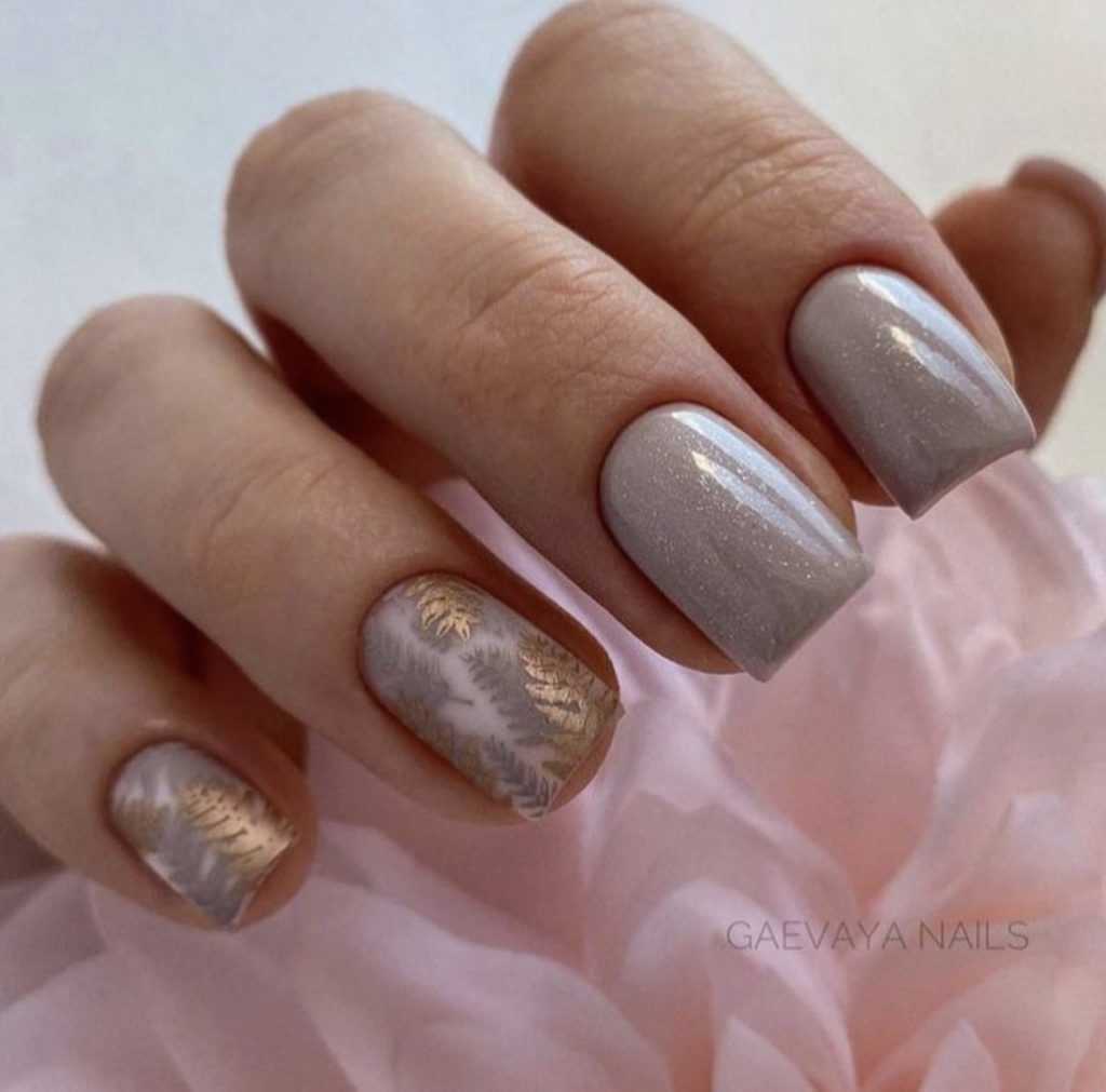 Существует полет фантазии, который позволяет сделать осенний маникюр более ярким и необычным. Сейчас в тренде кофейная тематика, когда на ногтях рисуют зерна или чашку с бодрящим напитком. Этот маникюр коричневый 2021-2022 с бежевым, желтым, золотым цветом, фото которого ниже, отличный, согревающий вариант для осени.