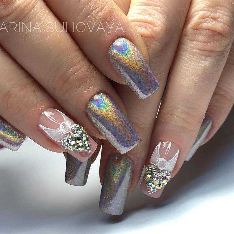 Базовое бежевое покрытие ногтей интересно комбинировать с зеркальной втиркой, единичными кристаллами, глиттером с эффектом голограммы. Ярко смотрятся короткие ногти полностью зеркальные. Чуть-чуть шикарного блеска не помешает.