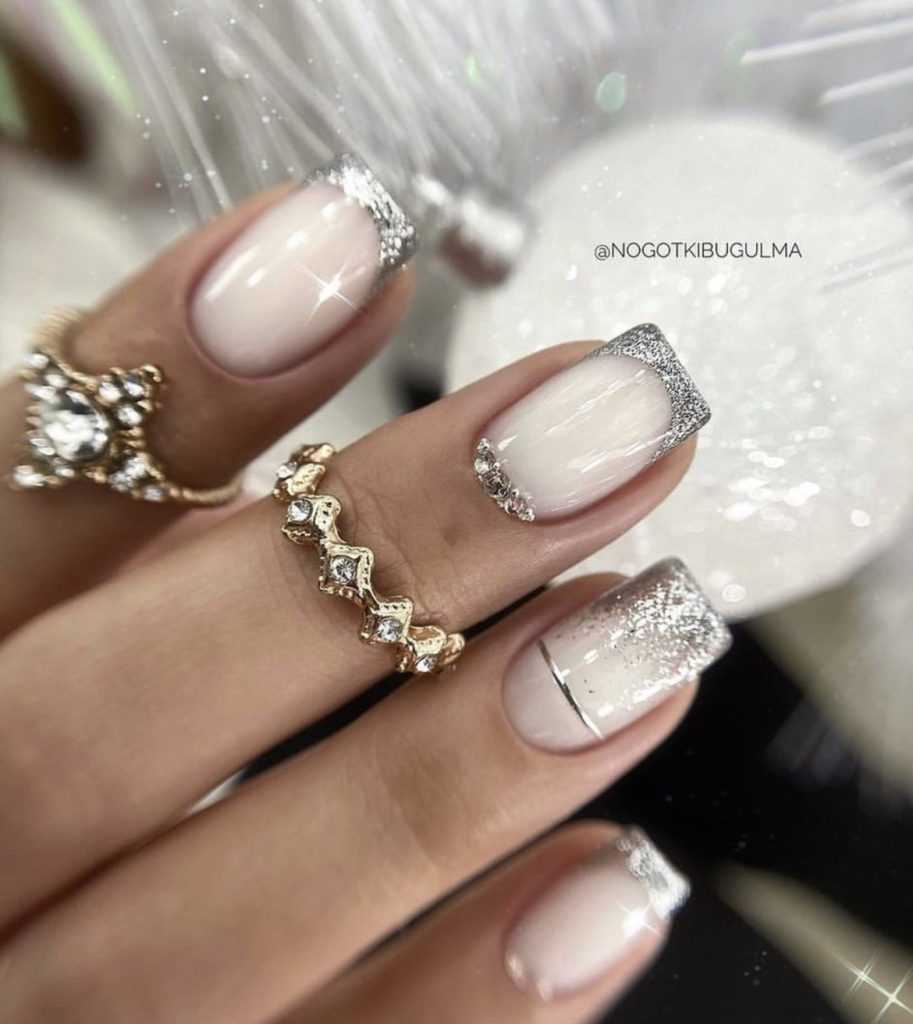 Единственным исключением являются мелкие серебристые блески. Ими можно дополнить сдержанный бежевый маникюр. Серебристыми блесками можно покрыть сразу несколько ногтей на руке, чередуя их с матовым или глянцевым телесным лаком.