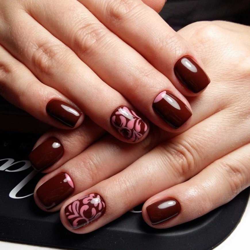 Из однотонных покрытий стоит обратить внимание на приглушенный коричневый, темный розовый, коралловый, бордовый. Что касается дизайнов, отлично будет смотреться белый френч или популярный babe boomer