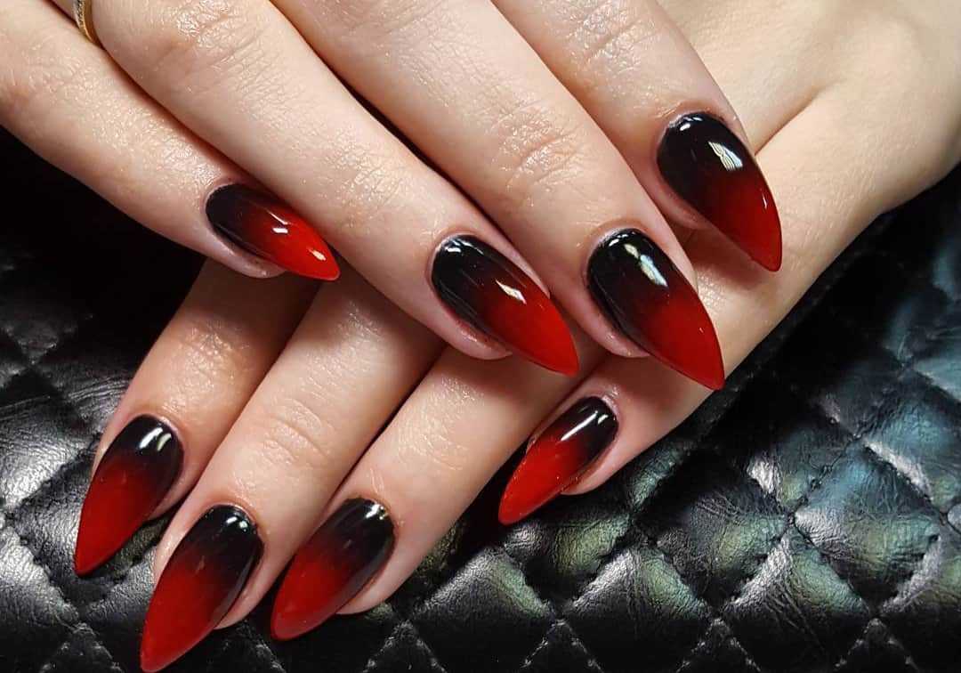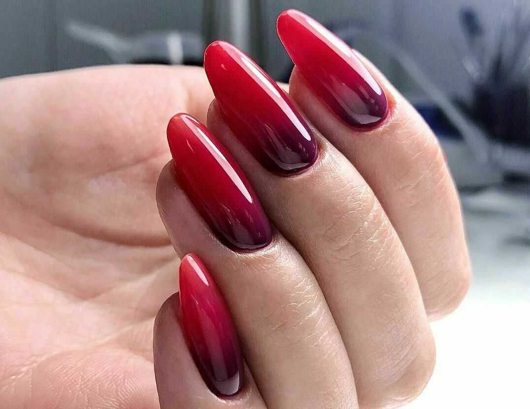 Плавный переход бордового к чёрному считается довольно привлекательной техникой распределения пигмента. Благодаря этому удается удлинить ногтевое ложе и сделать кисти рук более вытянутыми и изящными.