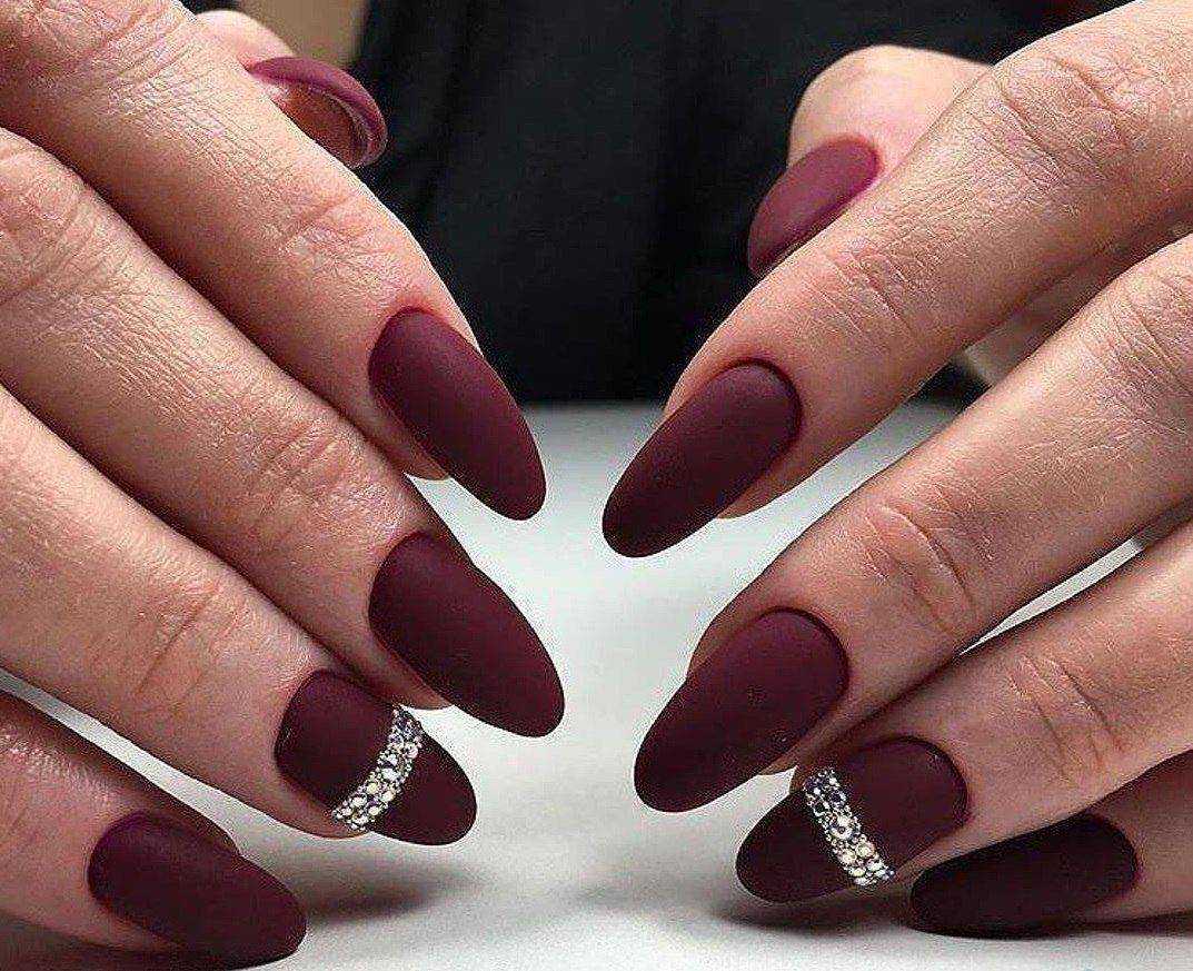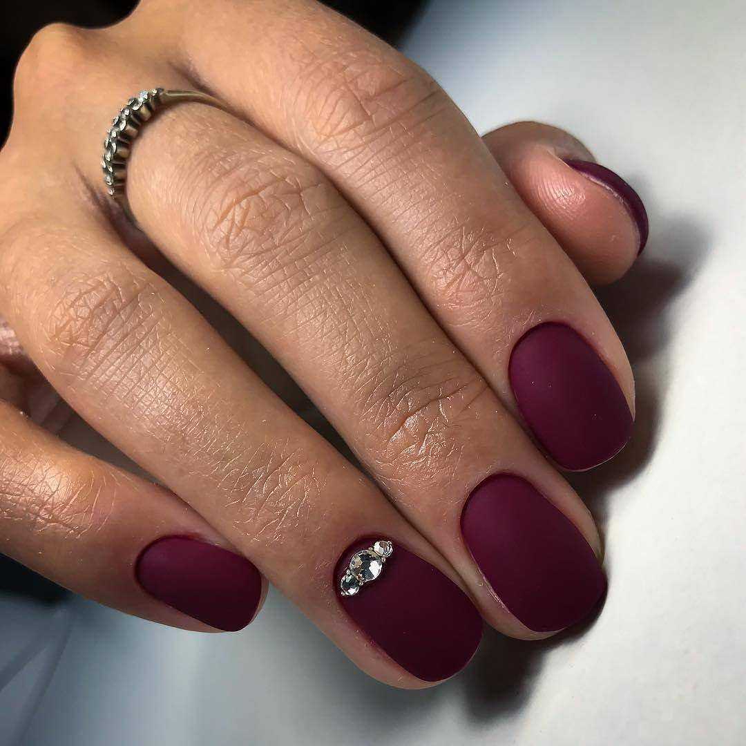 Со стразами. Камешки или стразы послужат богатым украшением для вашего маникюра: с помощью кристаллов собрать определенную форму или хаотично разместить их на поверхности ногтей. Ваша фантазия безгранична, вы можете создать свой собственный уникальный стиль; винный оттенок добавляет нотку роскоши.
