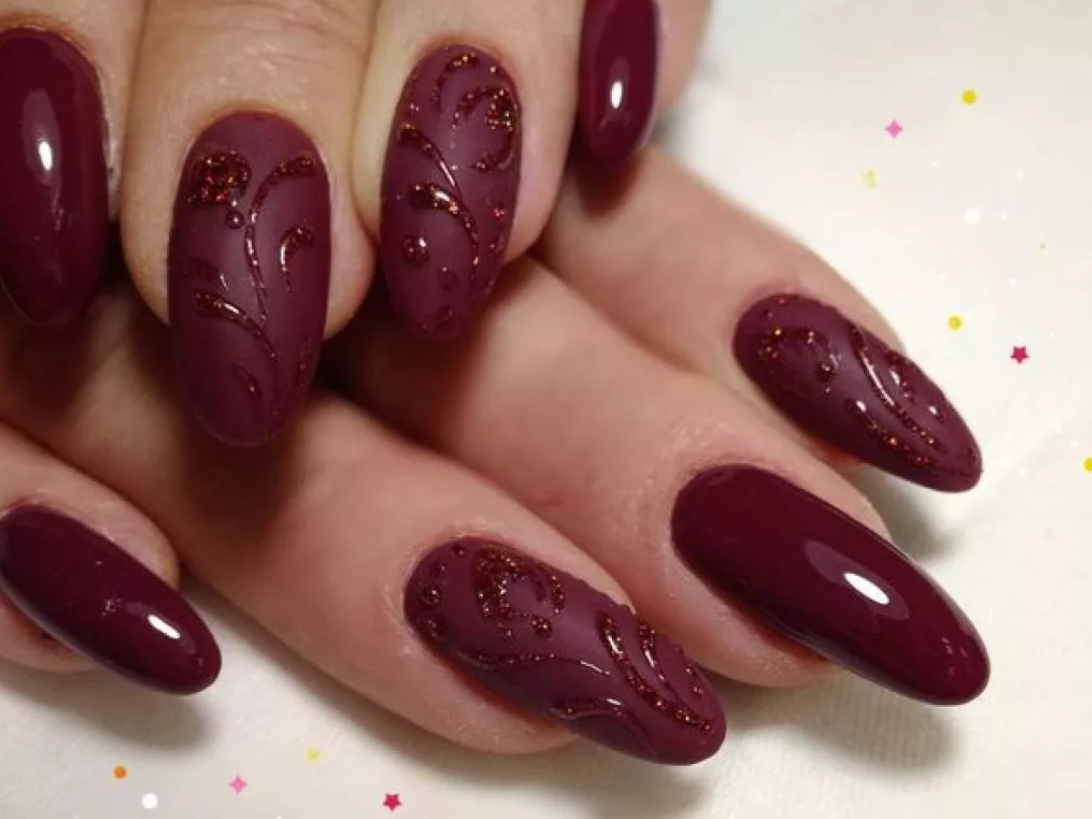Чтобы маникюр не смотрелся слишком просто на вечернем мероприятии, добавьте в дизайн стразы или украсьте его блестками. Эффектно выглядит матовое покрытие с восточным дизайном. И конечно, очень красиво сочетается бордовый маникюр с золотом: покройте все ногти матовым лаком, а один или два – золотым глитером, и ваши ногти засияют.
