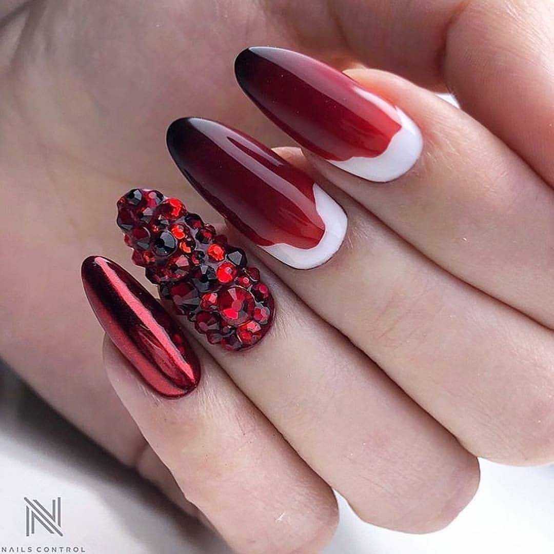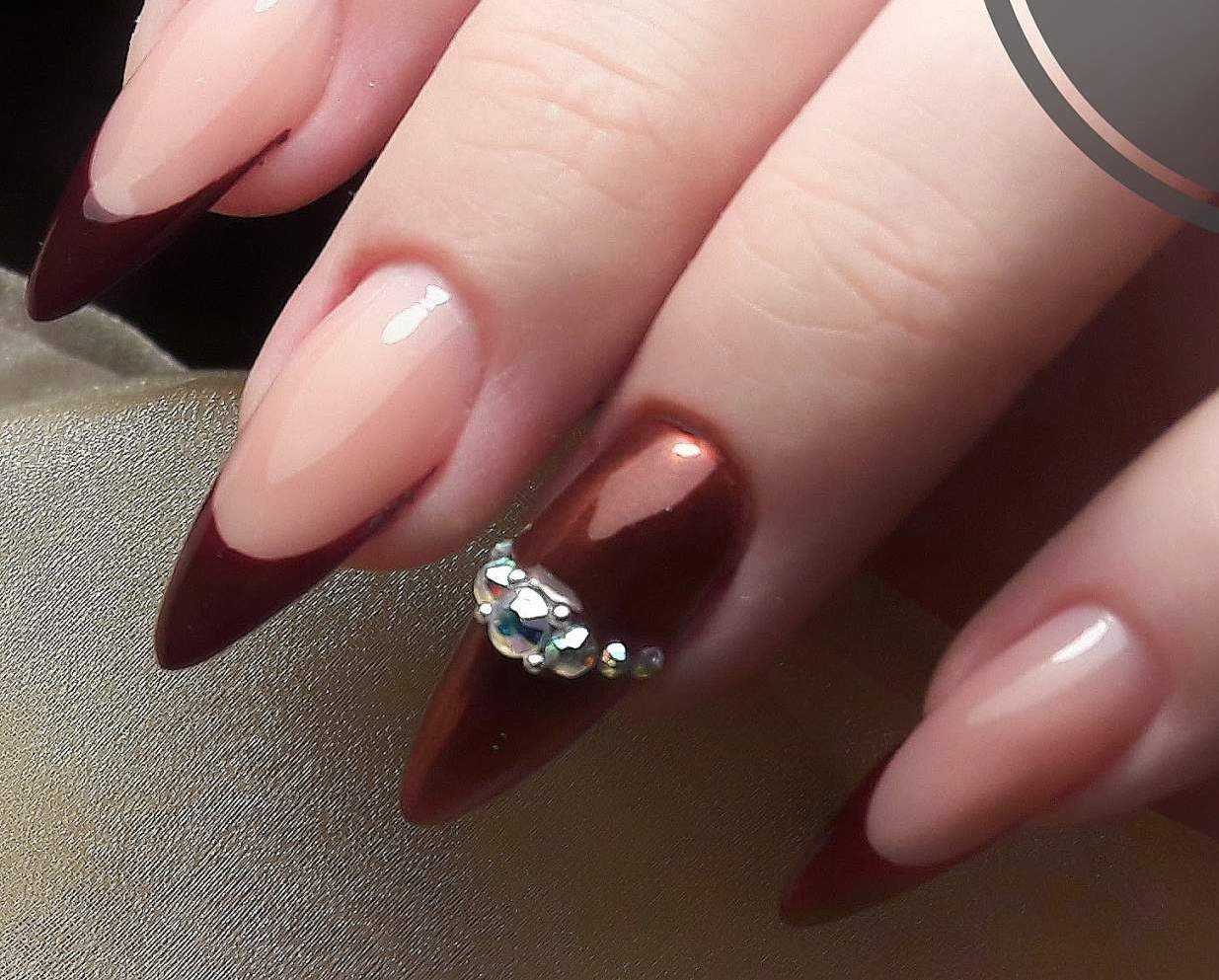 Французский. В этом маникюре темно-красный цвет наносится на верхнюю часть ногтя, а остальная часть может быть украшена, например, стразами.