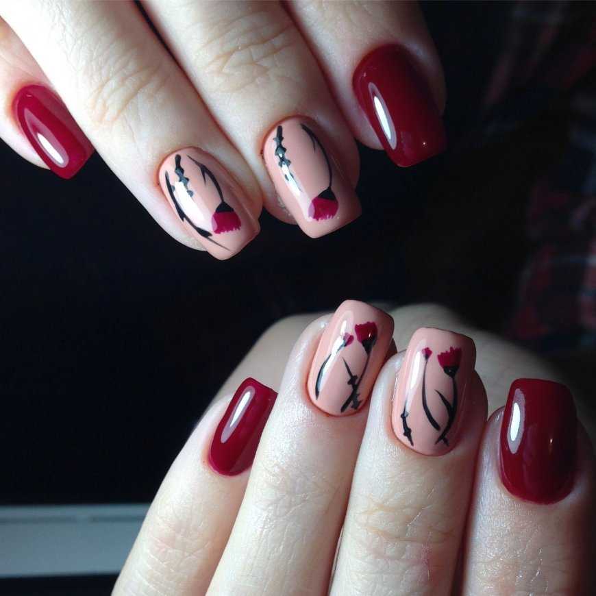 Стильное и популярное сочетание бордового и бежевого все чаще можно увидеть на женских ногтях. Эти два цвета прекрасно «сходятся» в любой цветовой вариации. Например, страстный бордовый со светло-бежевым или винный тон с темно-бежевой краской. Модный френч, разнообразный лунный нейл-арт, геометрия с использованием различных элементов декора — все это создаст шикарный дизайн.