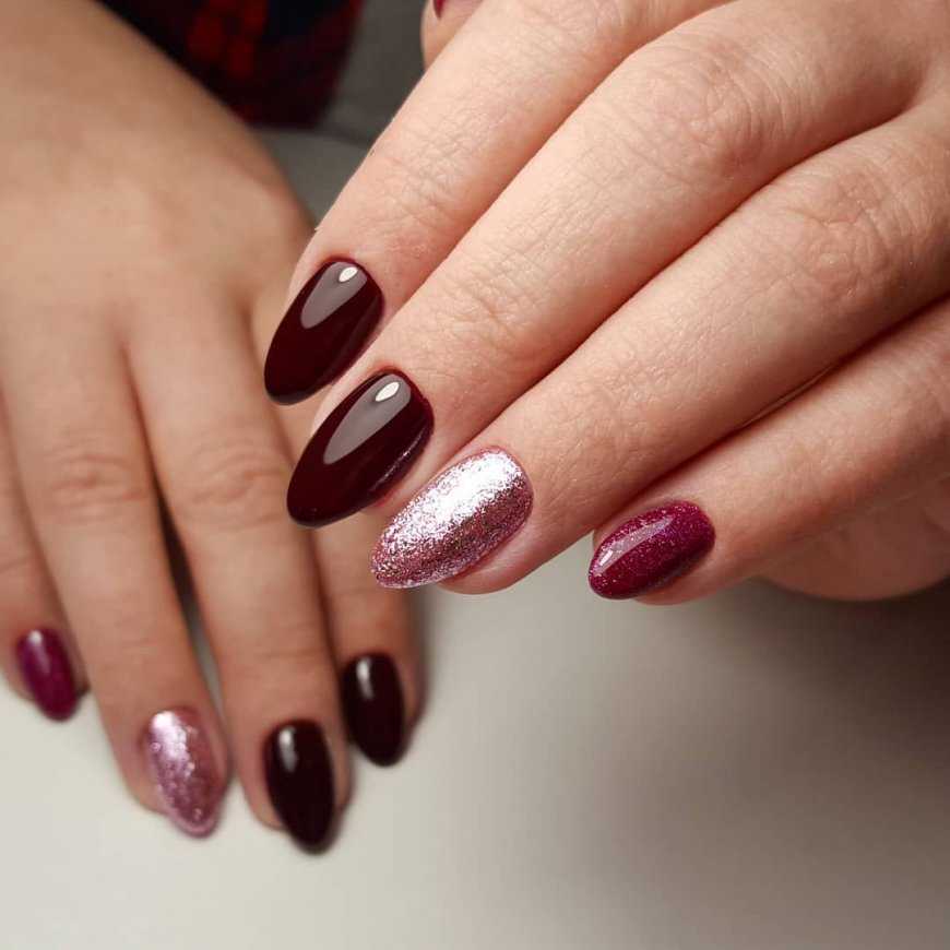Что касается формы ногтей, то здесь нет совершенно никаких ограничений. Бордовый нейл-арт особенно привлекательно выглядит на миндальных и овальных ногтях
