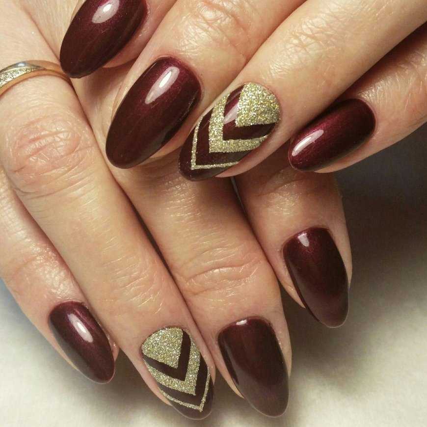 На торжество или в кафе на вечеринку будет актуально сделать маникюр, сочетая переливы бордо с золотистым оттенком. Можно использовать для этого золотистый лак, а также различные глиттеры и шаммеры.