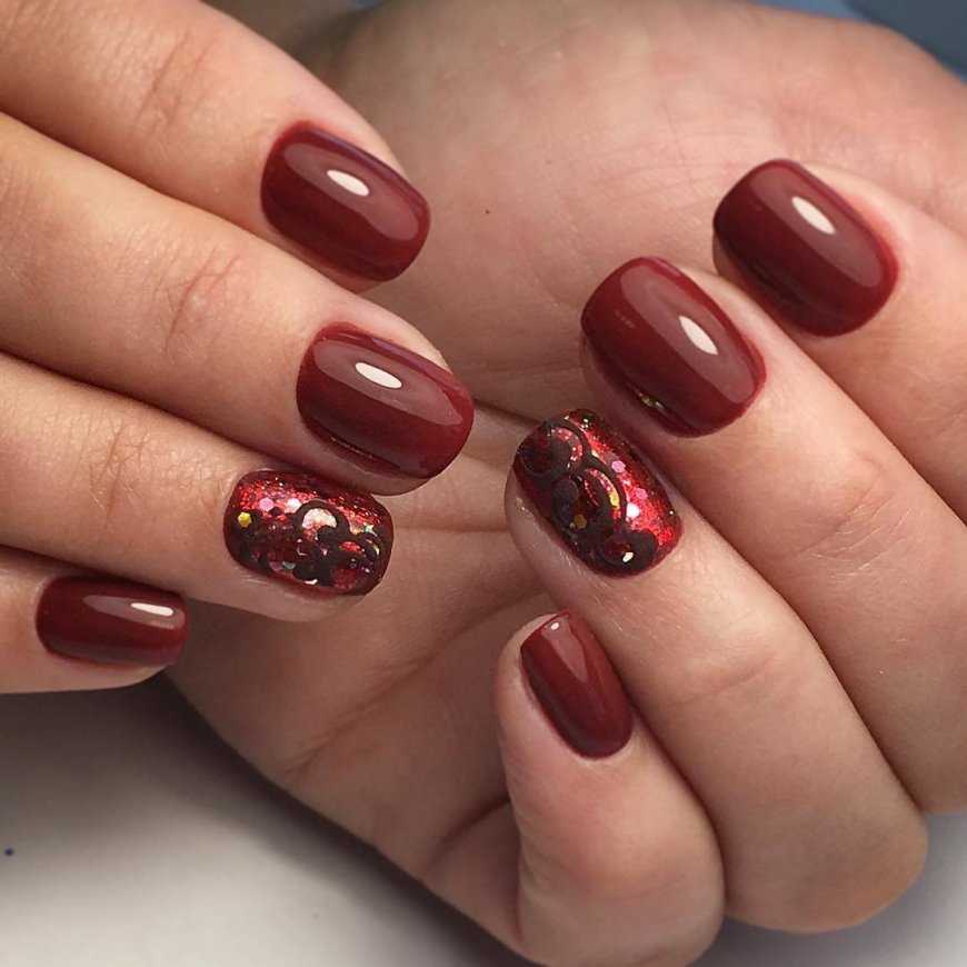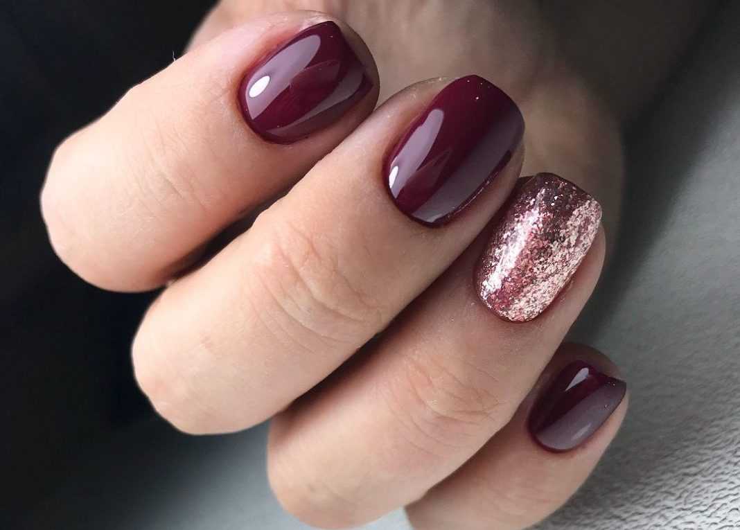 - сделать простой маникюр бордового цвета, выделив один-два акцентированных пальца;