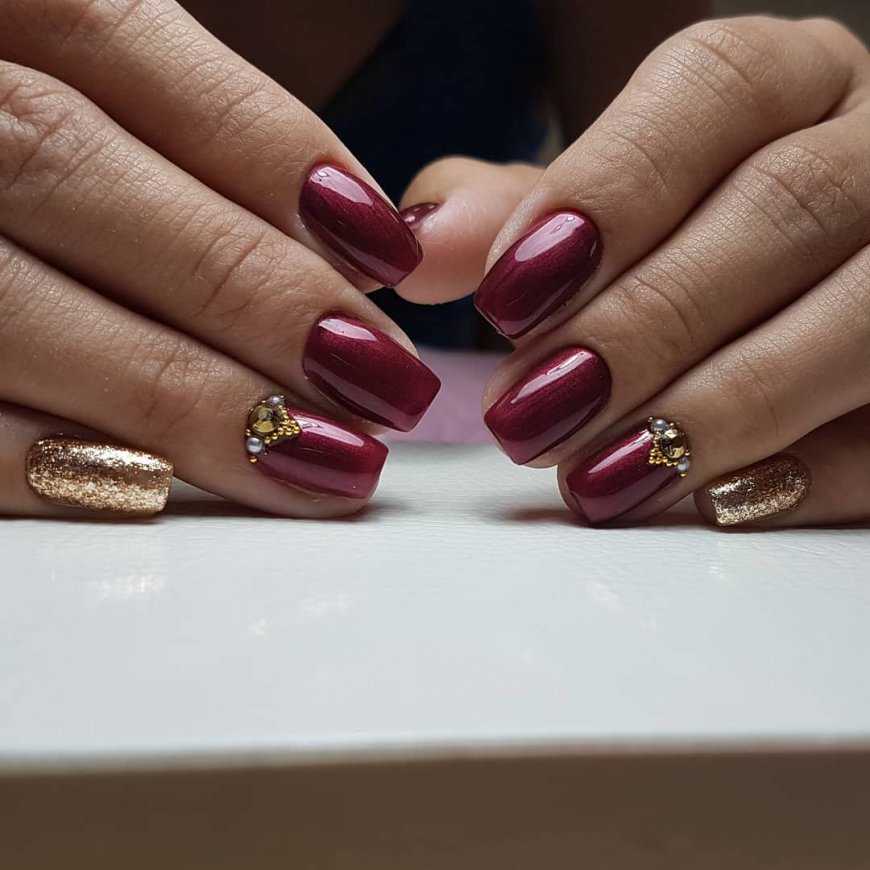 Классический вариант бордового маникюра сочетает в себя яркие акценты в виде золотого или серебряного пигмента. Они добавляют частичку роскоши и изыска.