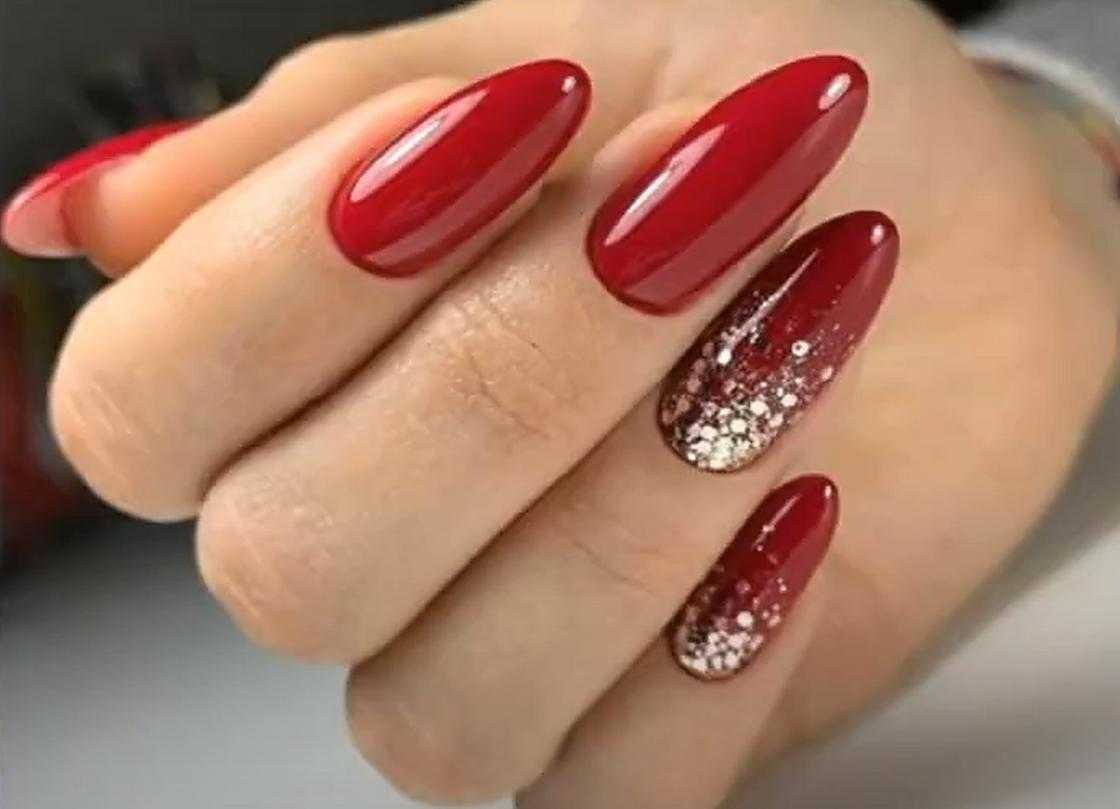 Сезонный. В зависимости от сезона можно использовать теплые или холодные оттенки насыщенного красного. Например, глубокий однотонный красный в паре с вином станет отличным вариантом осеннего маникюра. Эту идею можно дополнить, разбавив монохромный цвет золотыми блестками.