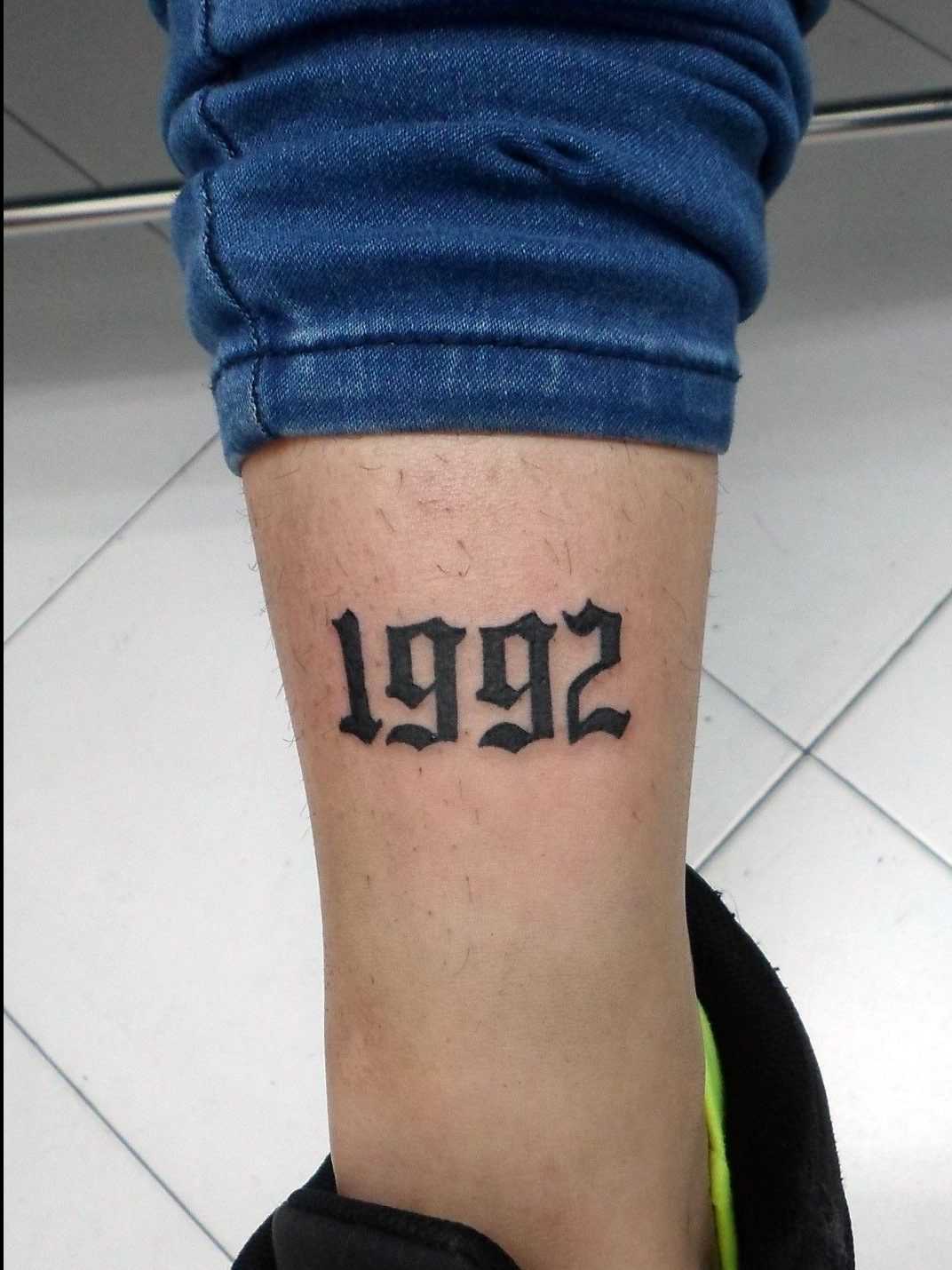 Татуировка даты римскими цифрами с короной на ноге — фото