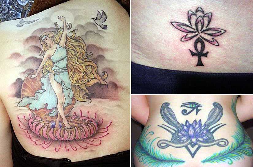 Тату богини Афродиты на лотосе, и египетские тату с лотосом и знаками из египетской культуры