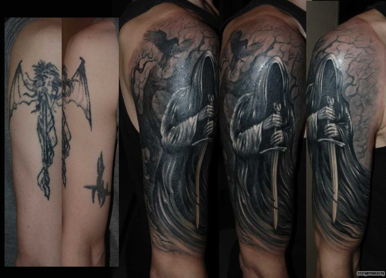 . Темный ангел часто изображается в черном капюшоне. Его предназначение — собирание душ. Такое тату может означать как страх смерти, так и презрение к ней.
