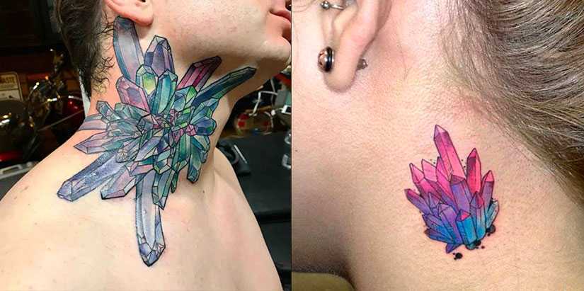 Необычно, но красиво выглядит тату кристалл на шее. Лучше всего делать её чуть ниже зоны роста волос (со стороны спины). Можно сделать большой рисунок на спине, изобразив часть пещеры, внутри которой растут кристаллы большими друзами.