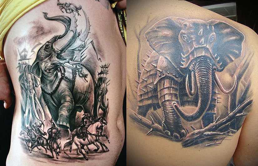 Основываясь на отзывах на профессиональных сайтах тату, можно сделать вывод, что нанесенный на спину, туловище или руки слон отличает толстая кожа, сильная защита и готовность к решающей атаке.