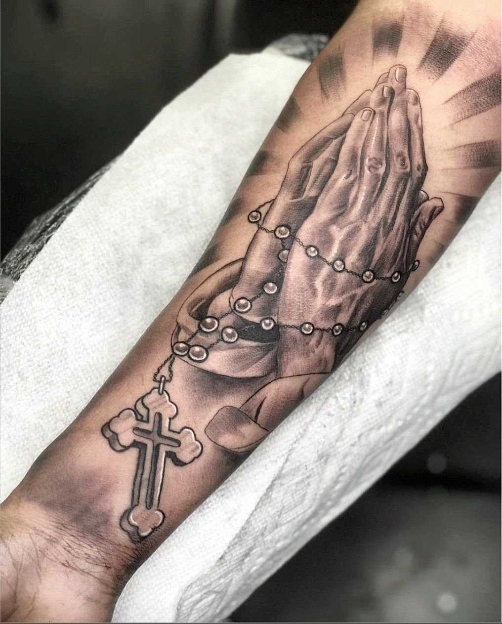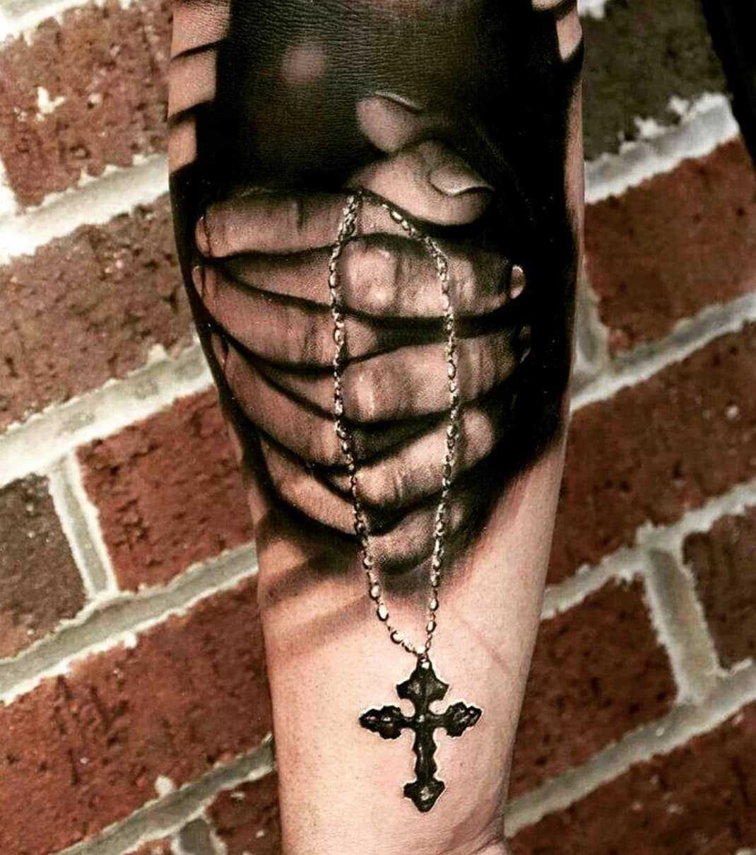 Татуировка креста на руке может выражать признательность высшим силам, благодарность им за помощь, служение богу и почитание заповедей.