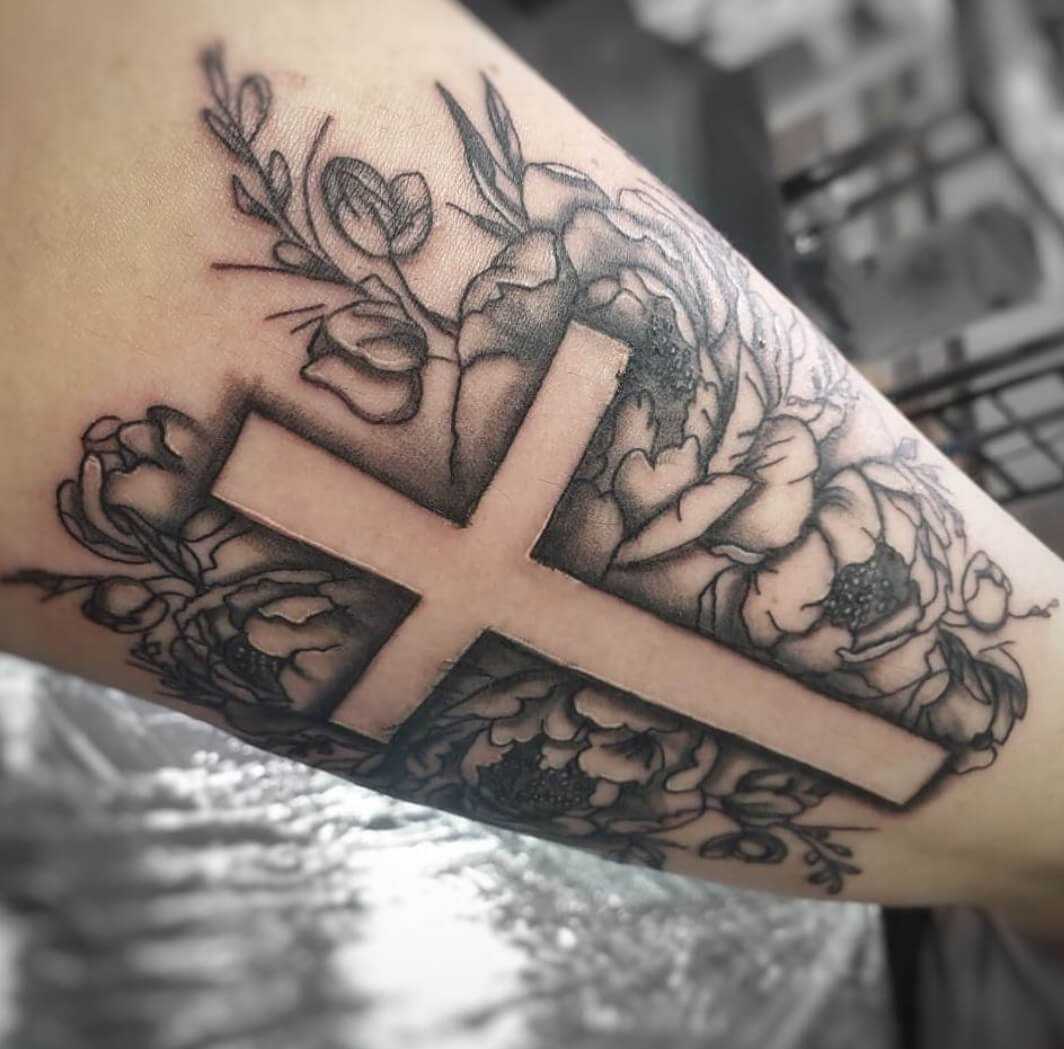 Оригинальный дизайн татуировки с крестом из разноцветных цветов.
