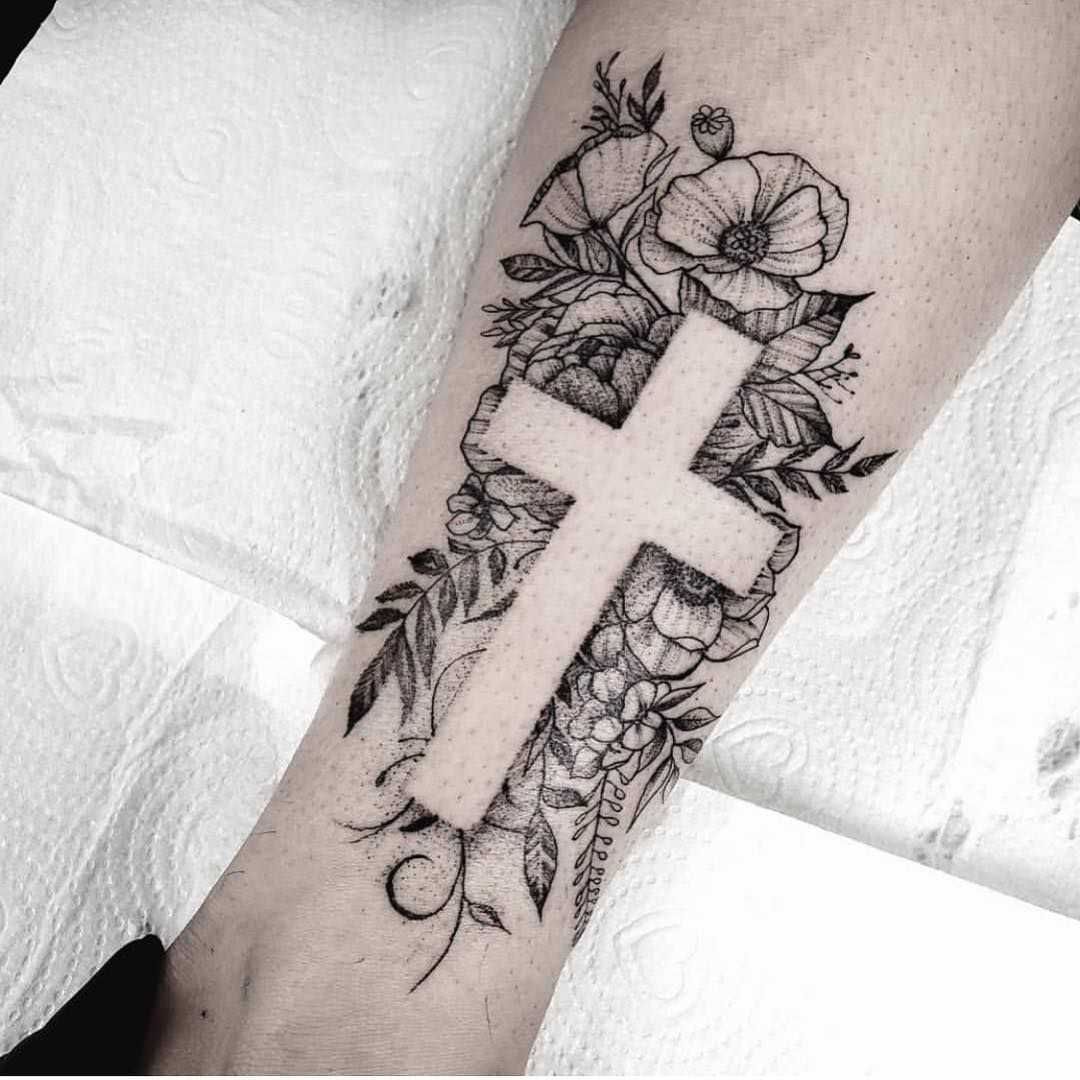 Красивая татуировка крест на руке женщины с красивыми деталями.