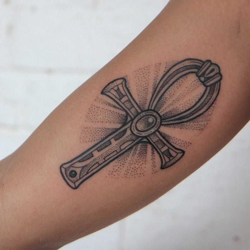 Особенность такого tattoo креста — наличие петли в верхней части знака. Это сакральный символ из древнеегипетской культуры, который еще называют ключом жизни. Он символизирует силу, мудрость, бессмертие и считается оберегом от несчастий.