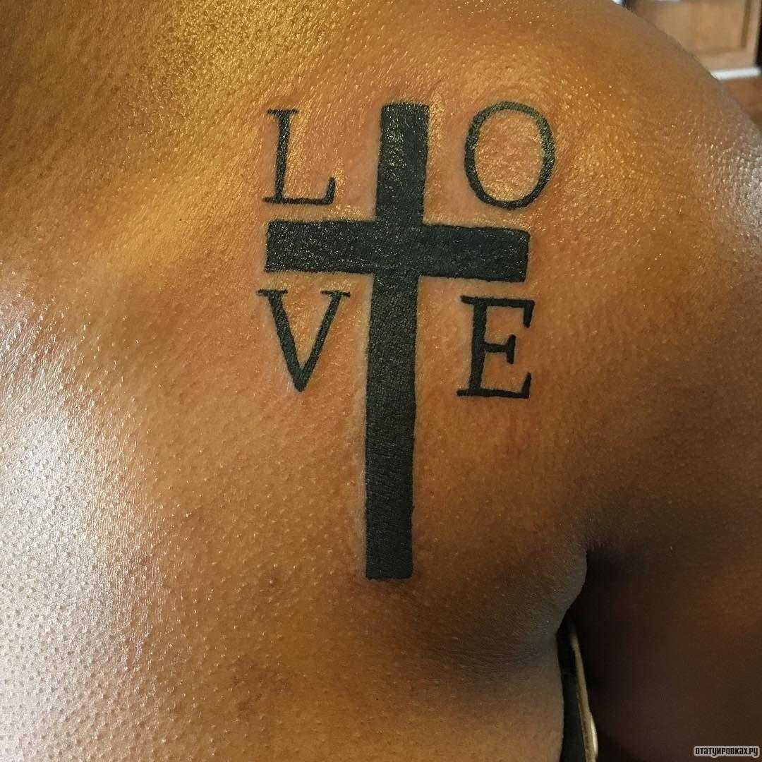 Тату для мужчин в виде креста, нанесенные на плечо, означают веру в рок, а также готовность встречать новый день. В некоторых случаях такое изображение означает память о перенесенной боли, мучениях. Те, кто увлекается эзотерикой, трактуют это тату как символ единения четырех сущностей. Точку пересечения линий считают местом зарождения всего живого на нашей планете.