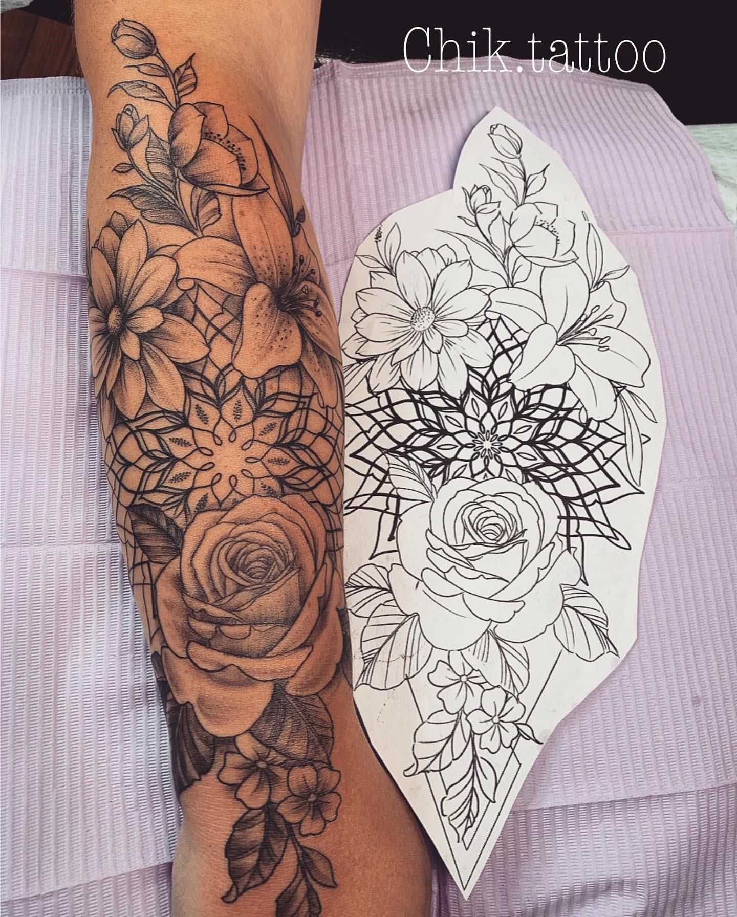Орнаменты, цветы, религиозная тематика — все это может быть в одном тату Женские рукава представляют собой переплетение изображений цветов, фруктовых плодов, силуэтов, иероглифов, конфет, куколок, мультяшных героев и логотипов определенных брендов. Нанесение такого варианта тату требует минимум 6 визитов в салон. Итоговый результат будет виден примерно через полгода.