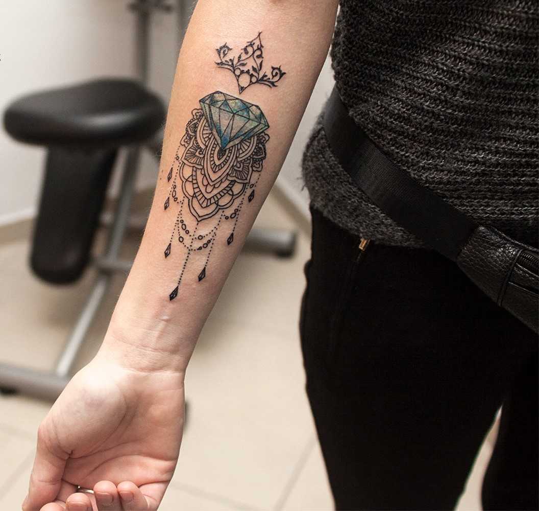 Испокон веков считается, что обладатель алмаза будет сильным в любом, даже самом страшном бою. За это значение татуировки алмаз ее любят и часто выбирают мужчины. А вот древние персы и турки считали, что если долго смотреть на камень, то избавишься от ярости и раздражительности, от мрачных мыслей и тоски. Игра света внутри алмаза способна поднять настроение и настроить на позитивный лад.