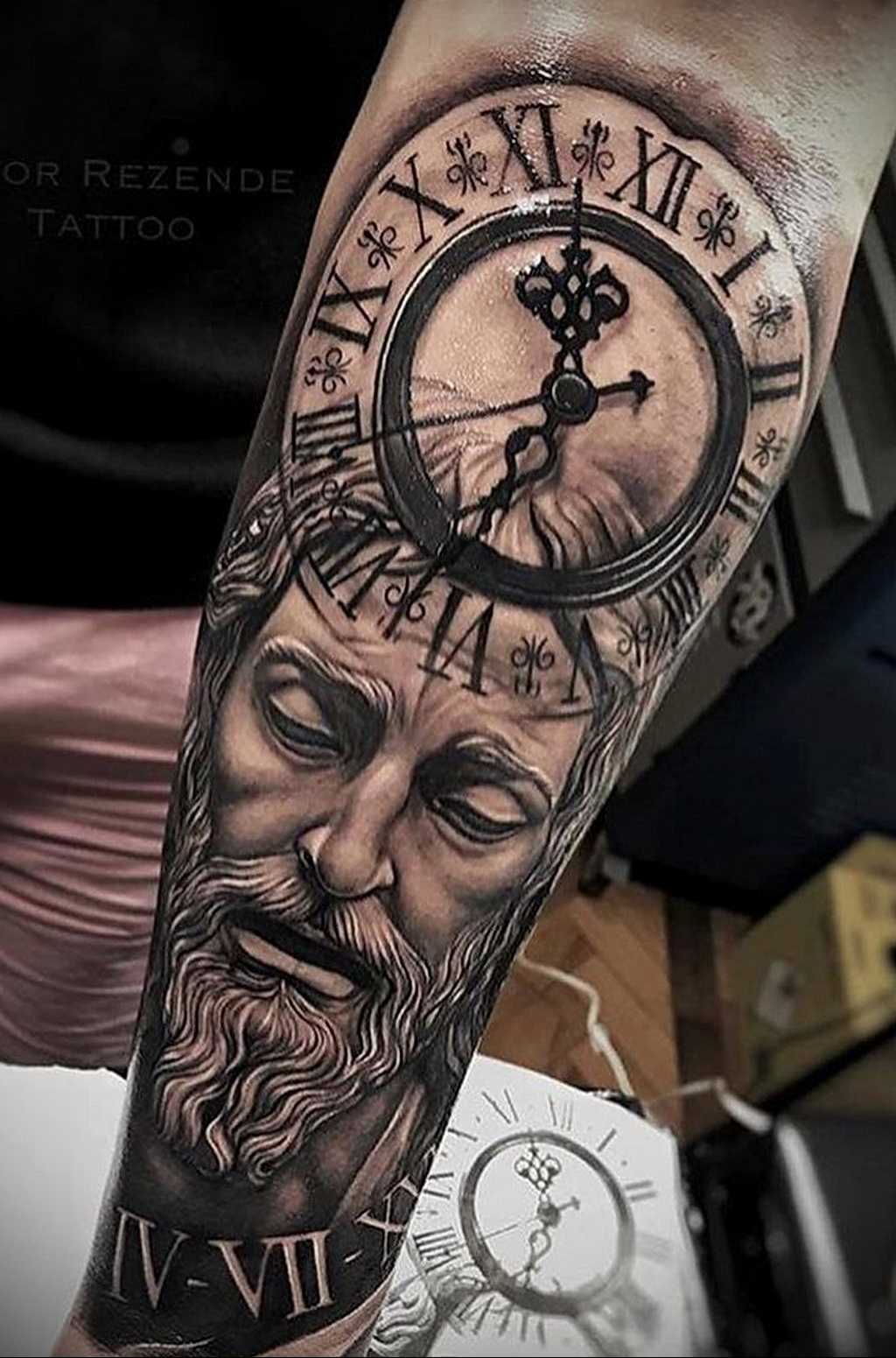 Рукав – это масштабная tattoo, занимающая все пространство руки мужчины. Если это будут часы, в таком случае смысл предполагается следующий – ценность проходящей жизни, осознание ее быстротечности.