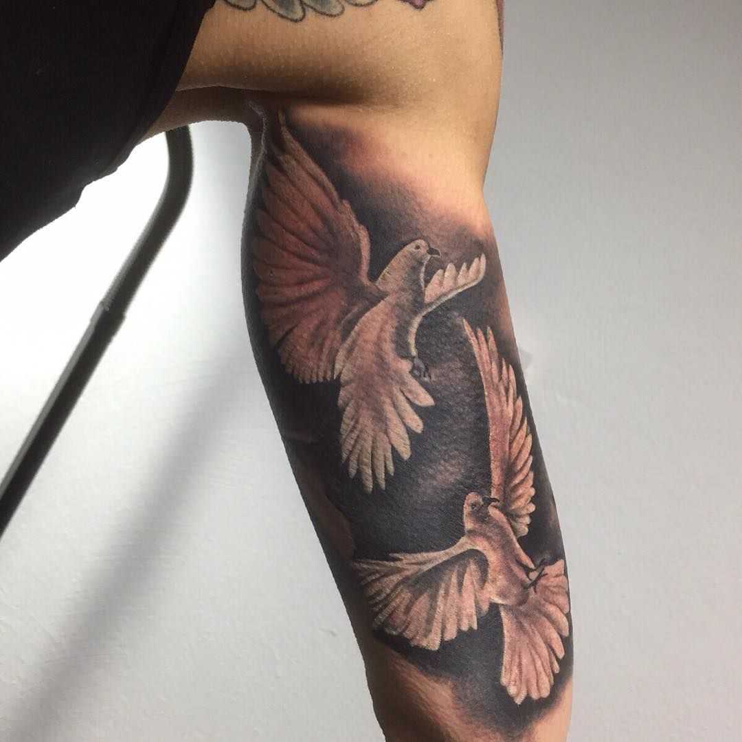 Чаще всего можно встретить реалистичные татуировки с голубями. Это не удивительно, ведь стиль, хоть и невероятно сложен в исполнении, позволяет изобразить птицу во всех деталях, делая ее “живой”. Наиболее популярны монохромные работы с белыми голубями, цветные татуировки обычно дополняют яркими розами, лентами и прочими декоративными элементами. Часто встречаются тату с религиозным сюжетом или даже репродукции известных картин на эту тему. Такие масштабные изображения часто занимают всю спину. Маленькие голуби на запястье, кисти, на шее или щиколотке тоже выглядят довольно гармонично, если эскиз лаконичен и не перегружен мелкими деталями. Интересны и необычны монохромные работы в стиле дотворк, состоящие из тысяч мельчайших точек. Такой рисунок будет хорошо смотреться, даже если у вас уже есть (или будут) татуировки в других стилях. Недостаток дотворка лишь в том, что такие тату сложно корректировать.
