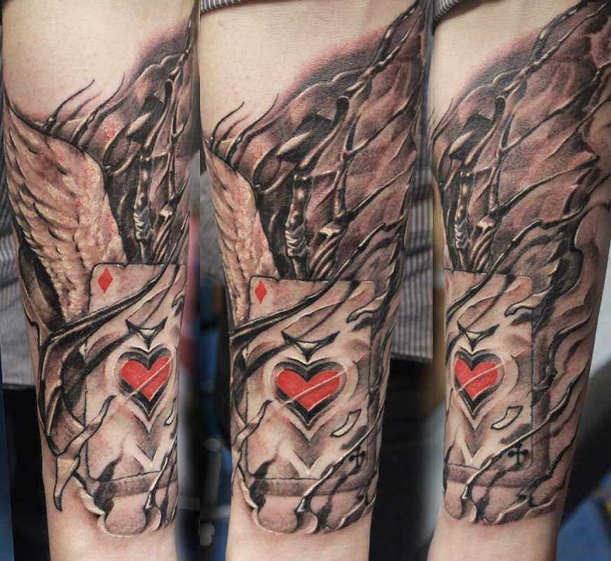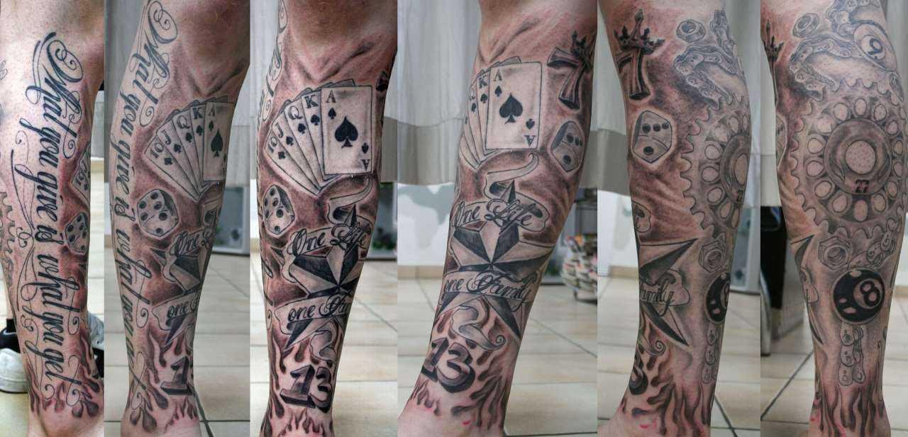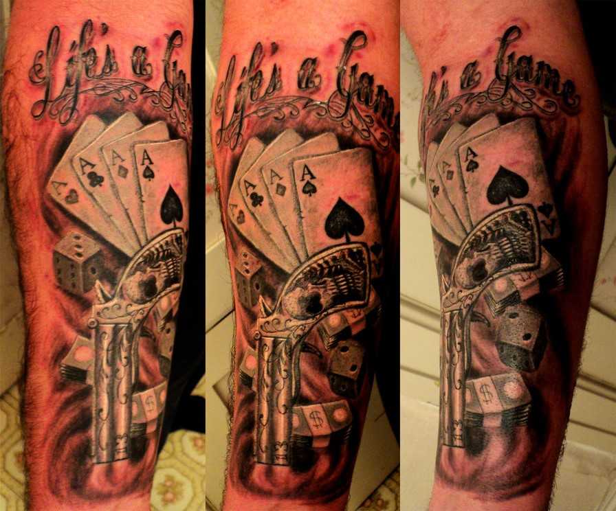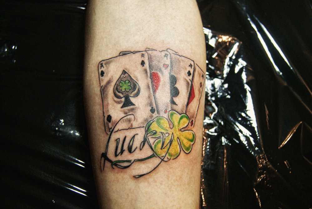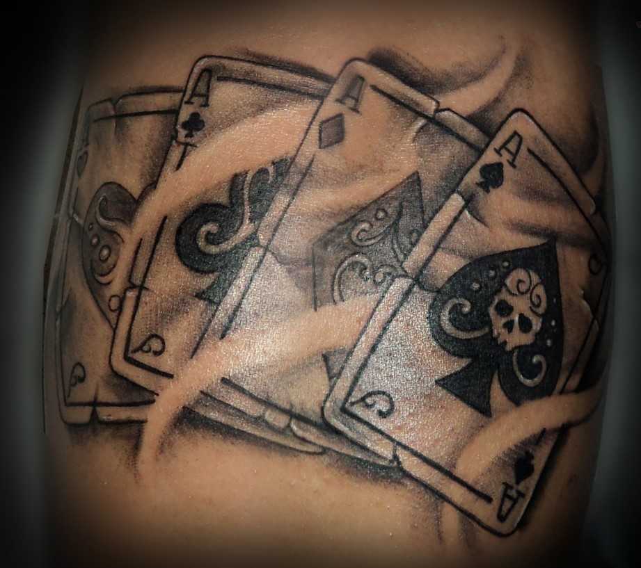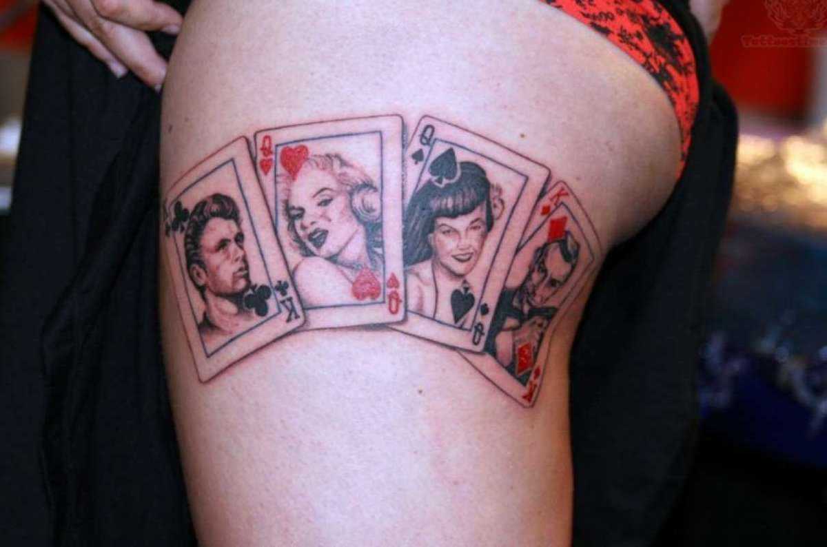 Значение татуировки с изображением игральных карт в первую очередь зависит от того, какая масть и значение выбраны для эскиза будущей наколки. Кстати, звучит неправдоподобно, но разделение по мастям нам предоставило христианство. Карты – это главный символ богохульства, ведь они отображают неуважение к Иисусу Христу и его страданиям, смерти. Причина этого скрывается в том, что карты имеют прямую связь со Страстями Христовыми. Пика – это символ черного копья, пронзившего ребра Иисуса, креста – символ креста на котором его распяли, черва – символизирует губку с уксусом, а бубна – это гвозди, которыми Спасителя крепили к кресту.