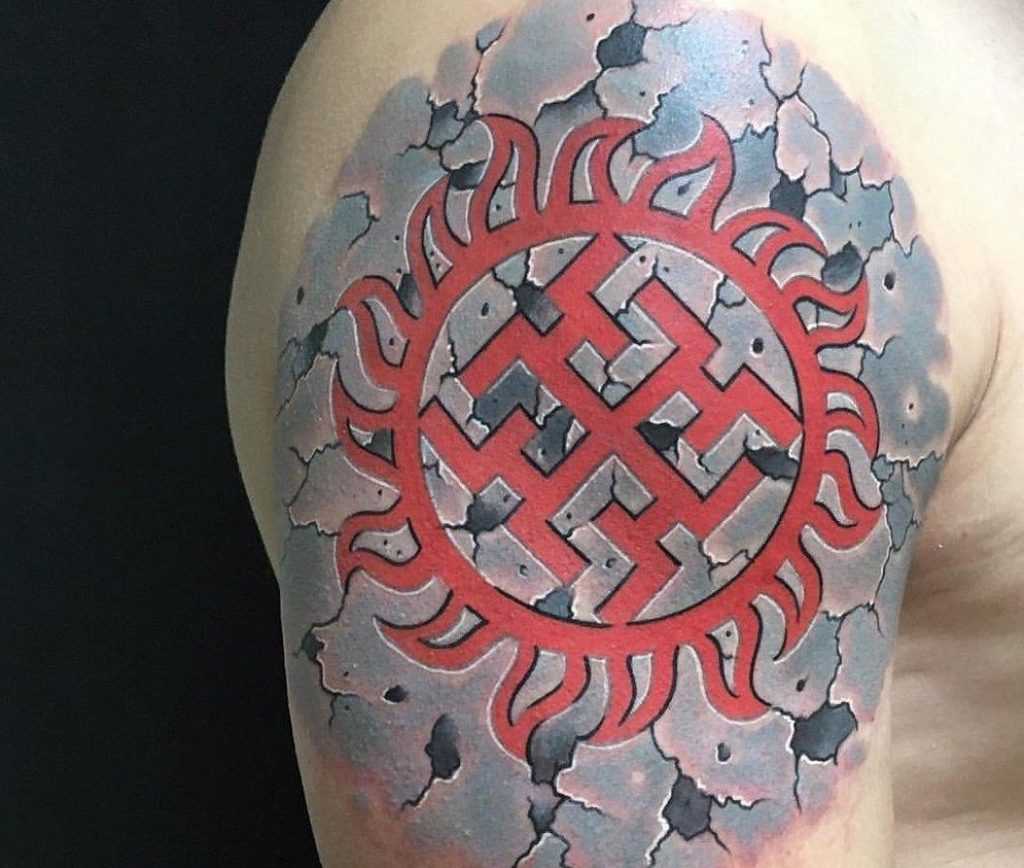 Пожалуй, реализм — один из самых подходящих стилей для такой татуировки, ведь можно придумать абсолютно любой сюжет изображения. Например, очень круто выглядит реалистичный доспех со звездой Руси на плече. Такая работа будет говорить не только о мастерстве и таланте своего владельца, но и мужестве, воинской доблести и благородстве. Встречаются красочные работы, включающие изображение самого небесного кузнеца, воинов и ремесленников, волков и жар птиц. Однако чаще всего можно увидеть татуировки с квадратом Сварога, выполненным в виде каменного барельефа с 3D эффектом.