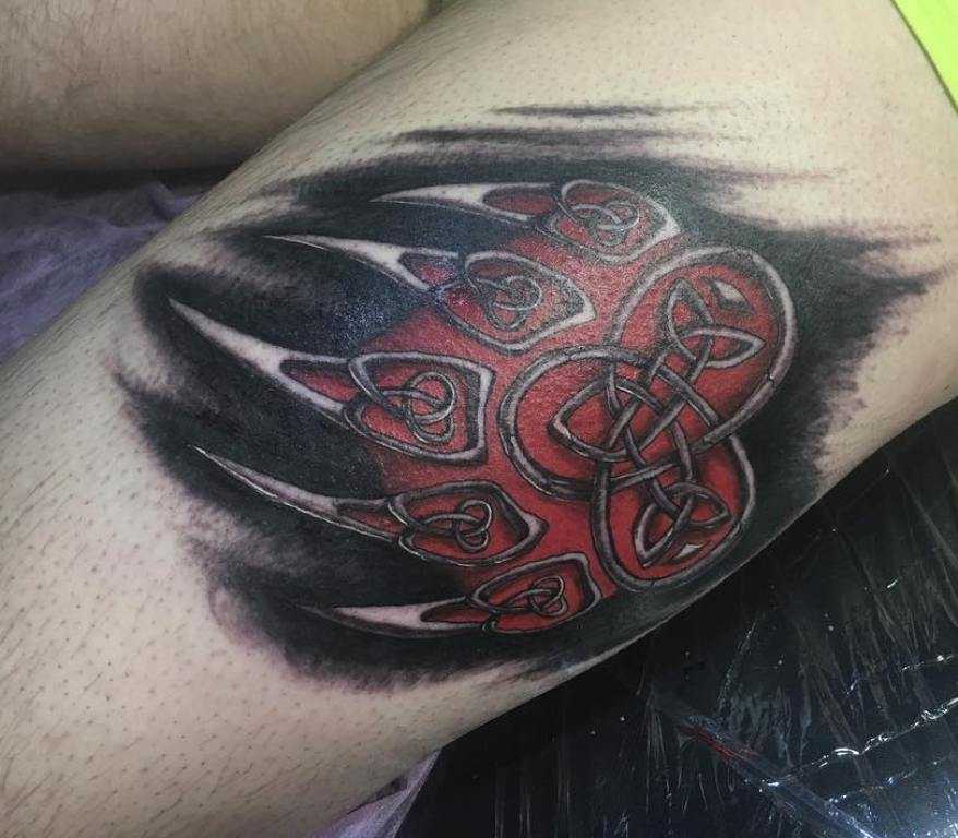Лапа медведя является знаком Бога Велеса. Эта защитная татуировка обозначает динамику и движение, его часто располагают в центре спины. Прекрасный защитный тату амулет для людей, которые любят путешествовать.