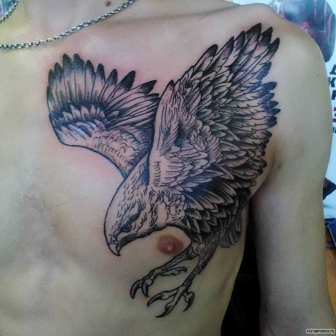 - Эскиз орла на груди присуще целеустремлённым, коммуникабельным личностям.
