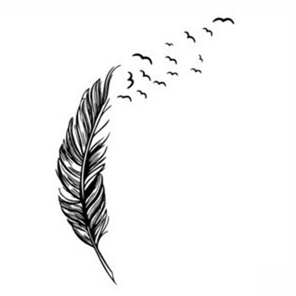 Тату перо с птицами. Значение этого рисунка – свобода, независимость и сила духа. На сегодняшний день, это один из востребованных эскизов для девушек.