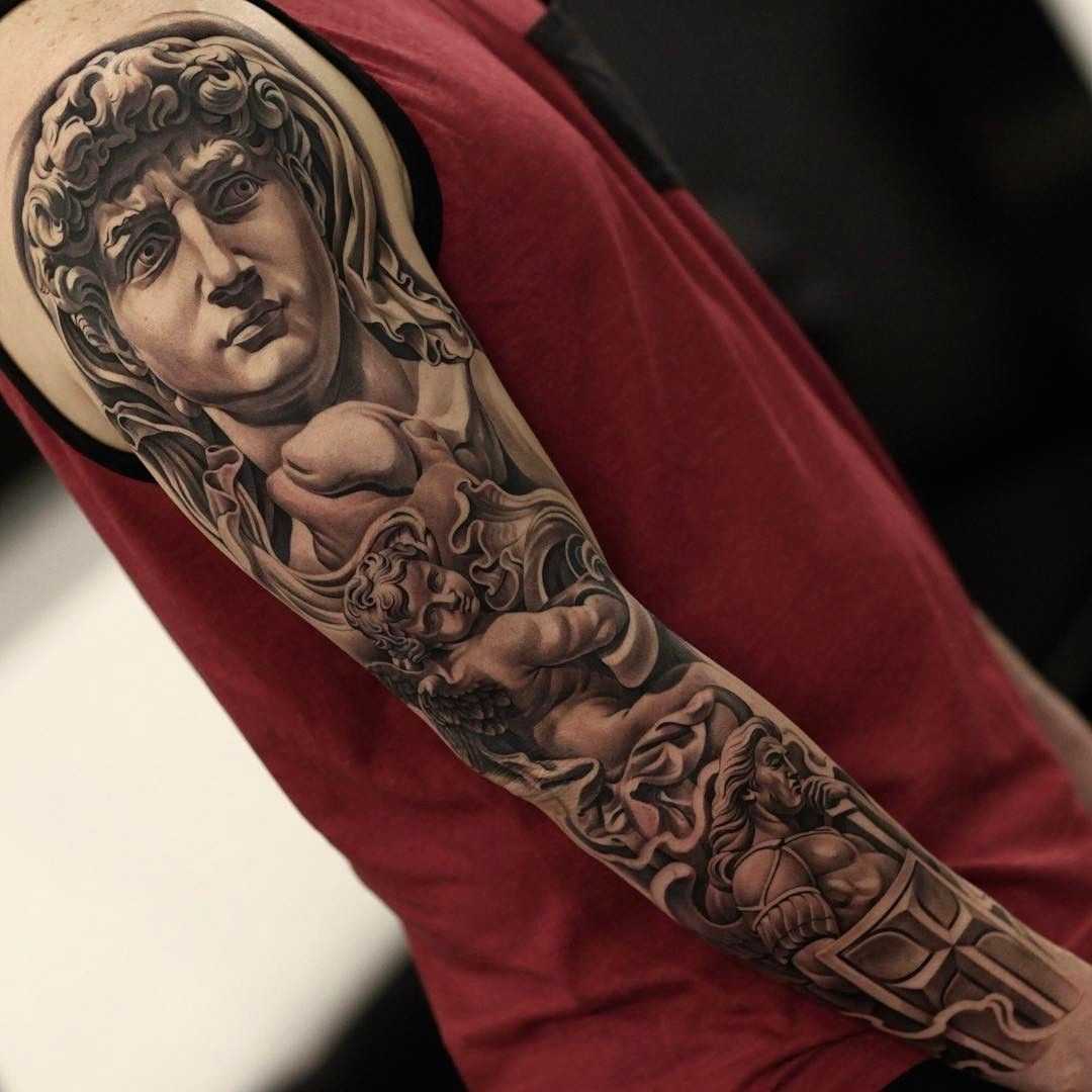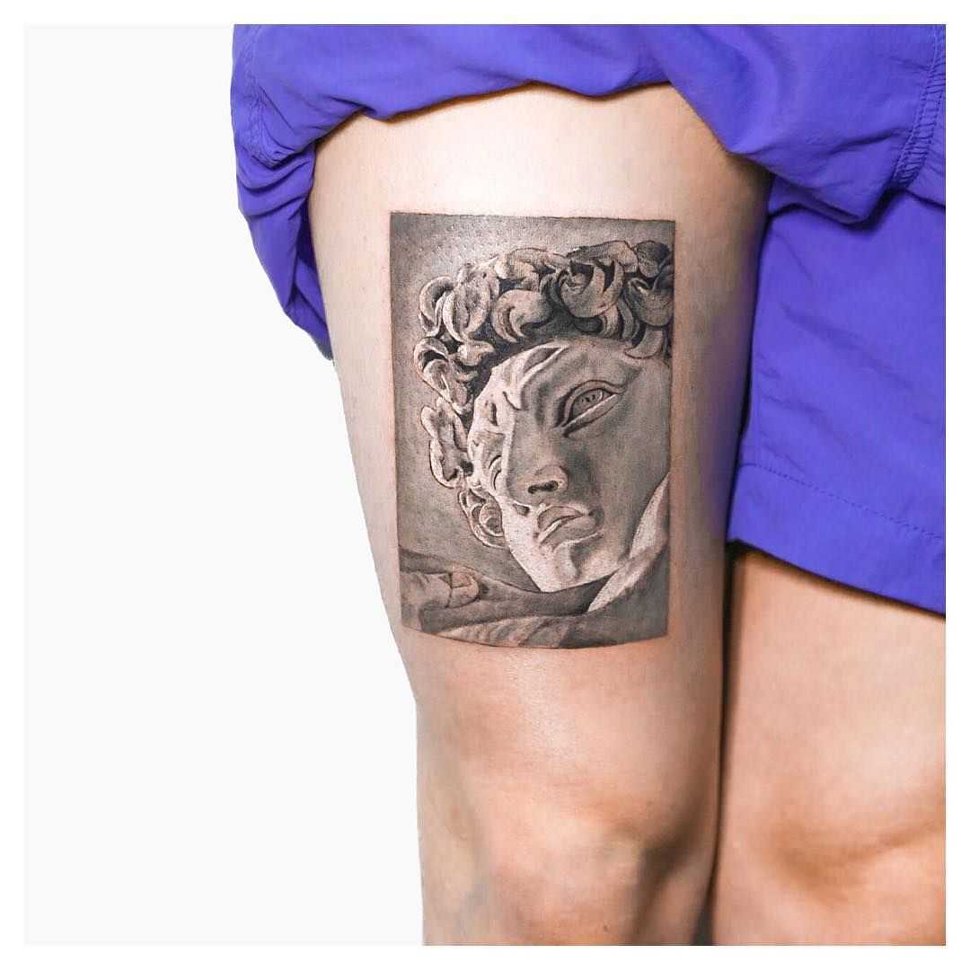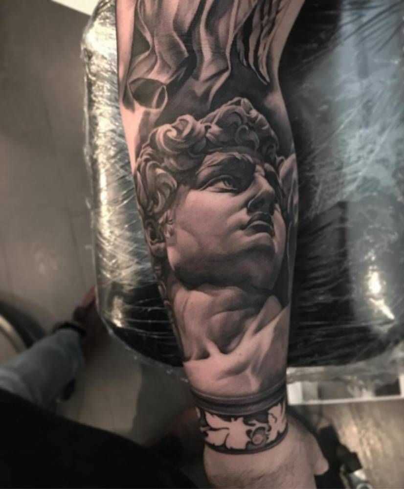 Татуировка Давид в стиле реализма может иметь очень детализированное изображение Давида и Голиафа, что может создать очень реалистичный и живой эффект.