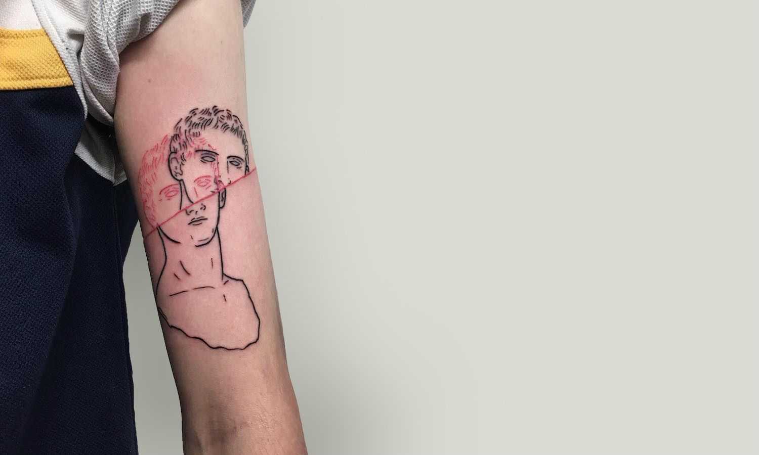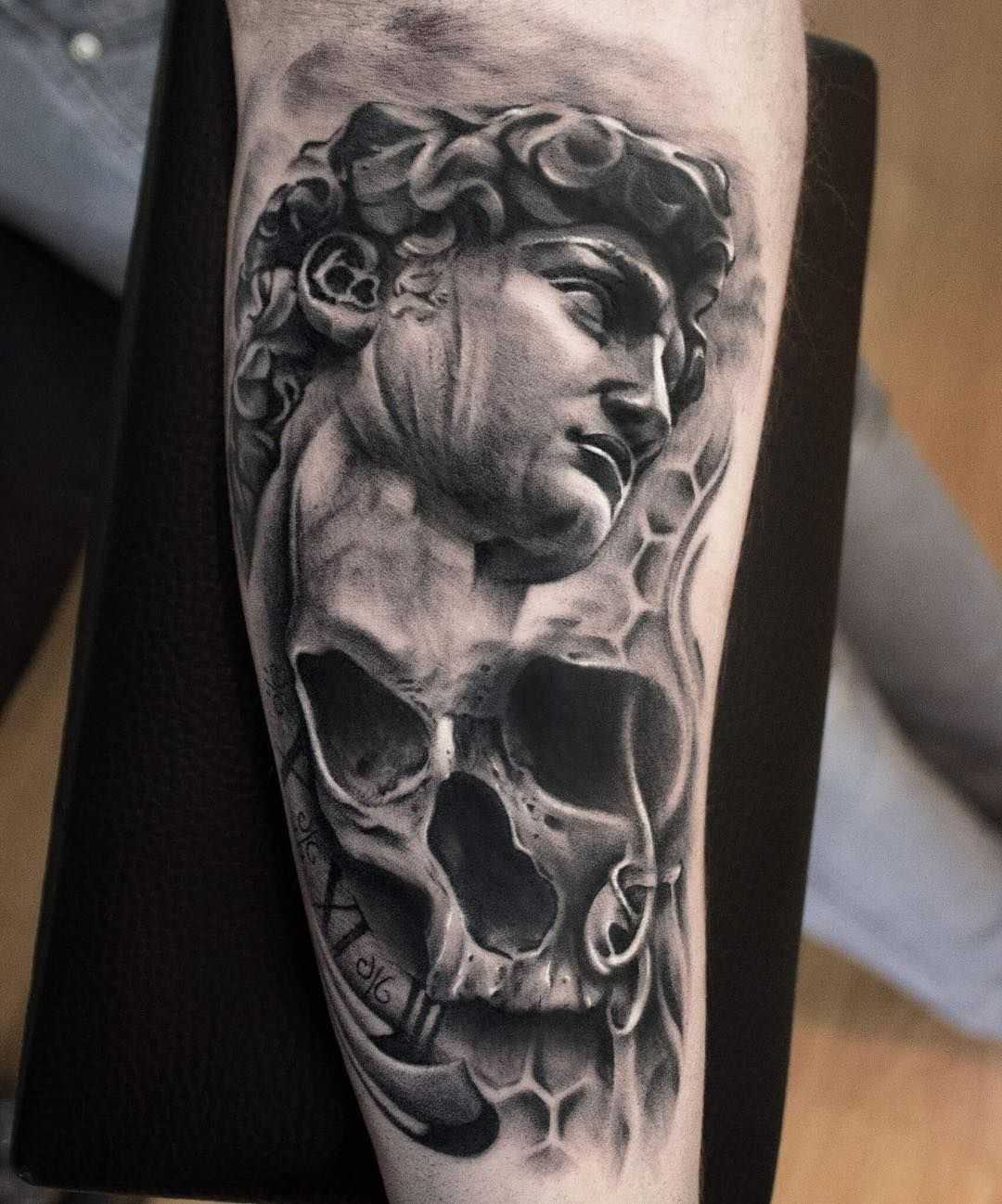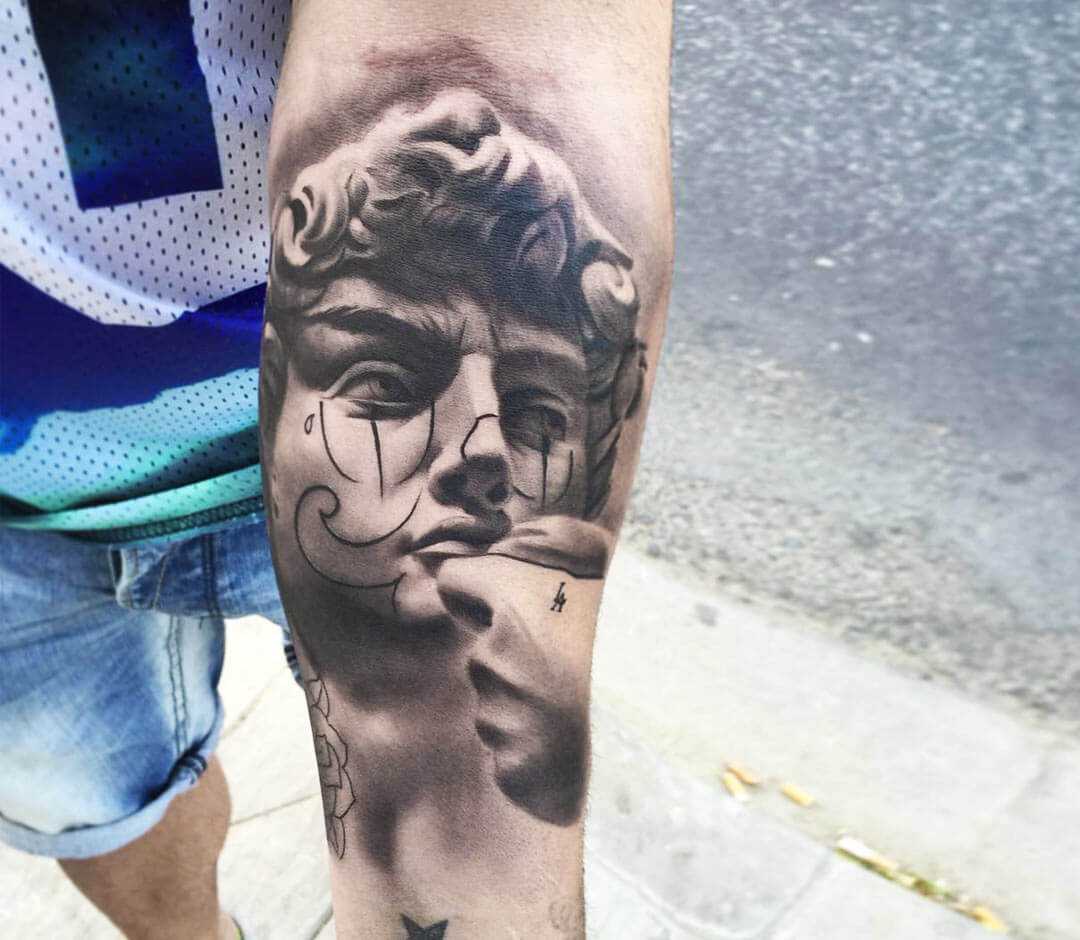 Татуировка Давид в стиле реализма может иметь очень детализированное изображение Давида и Голиафа, что может создать очень реалистичный и живой эффект.