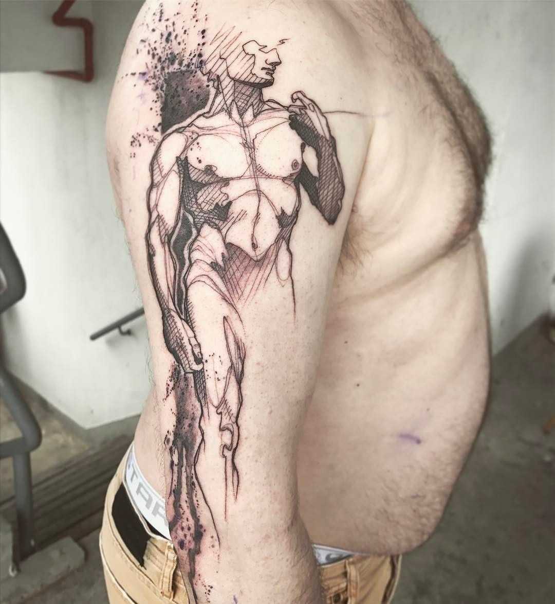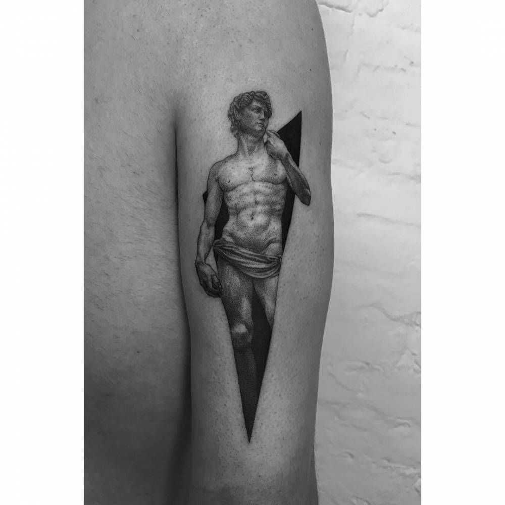 Татуировка Давид в графическом стиле может использовать геометрические фигуры и линии, чтобы создать более абстрактное и современное изображение.