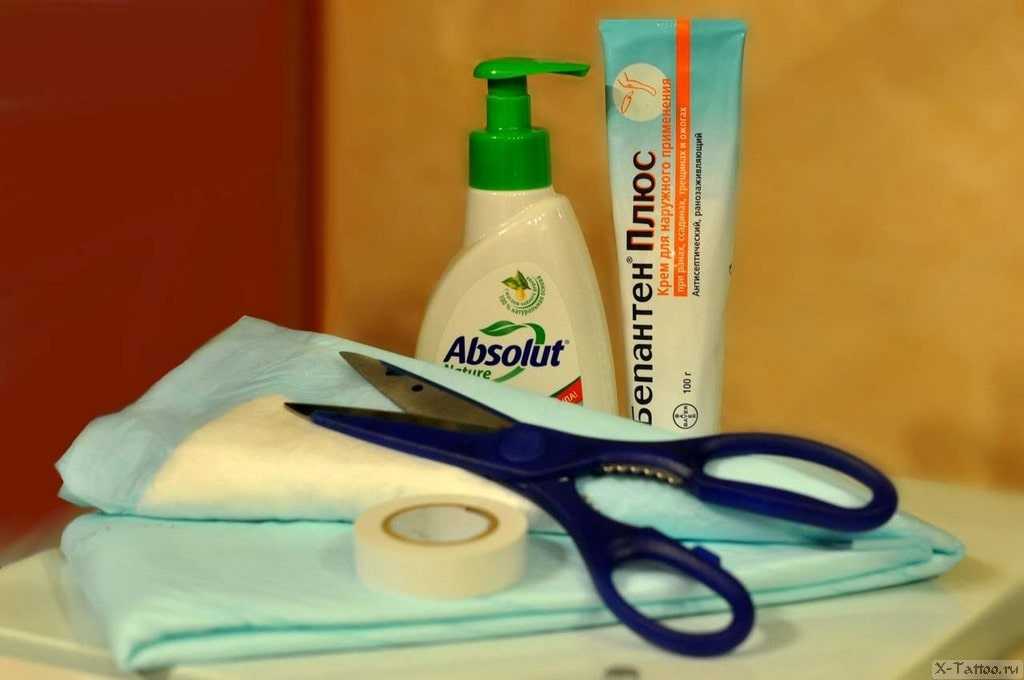 Пленку, в которую обернут рисунок в салоне, предварительно смазав его заживляющей мазью, нежелательно снимать до возвращения домой. Дома рекомендуется промыть татуировку теплой водой с детским мылом, а затем дать ей высохнуть. Использовать мочалку или полотенце воспрещается.
