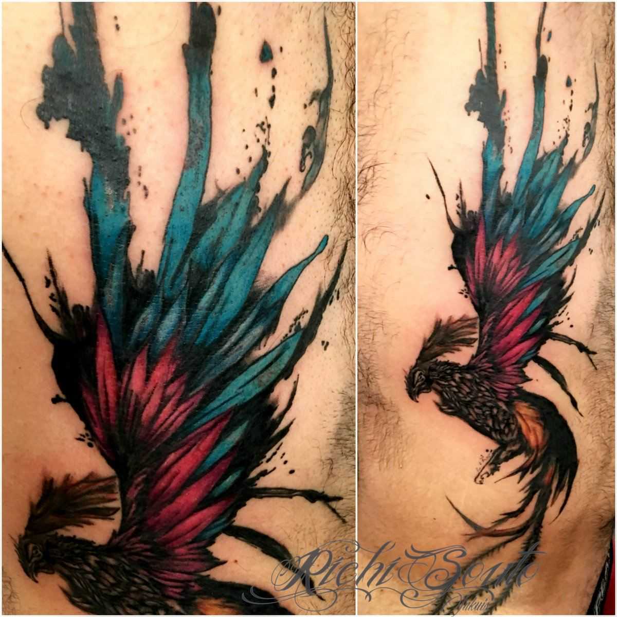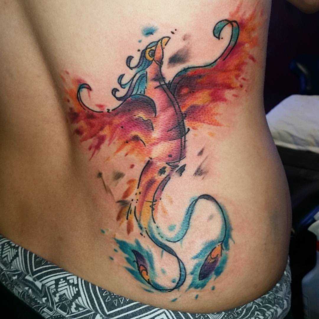 Тату феникс на боку акварель