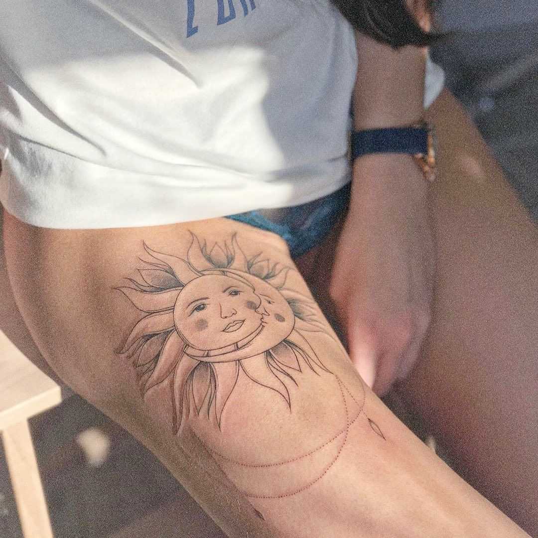 Модные тату на бедре для девушек 2022 года — фото и эскизы