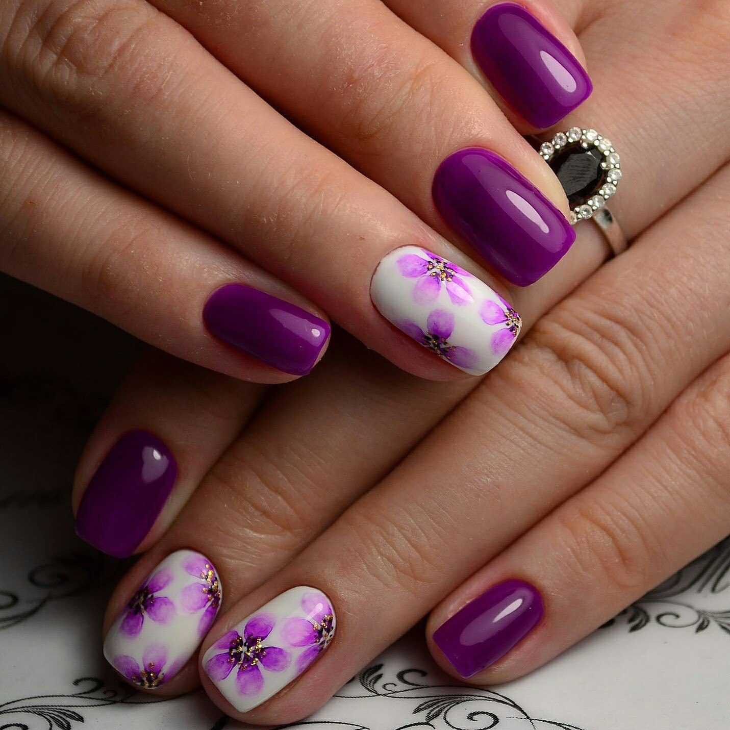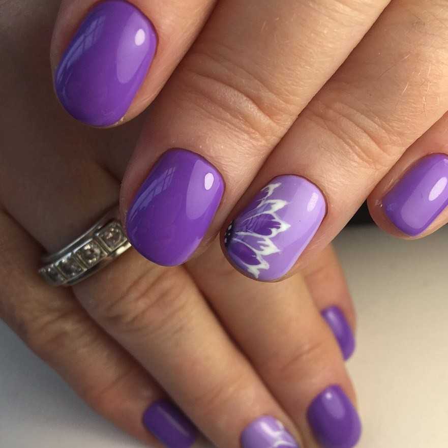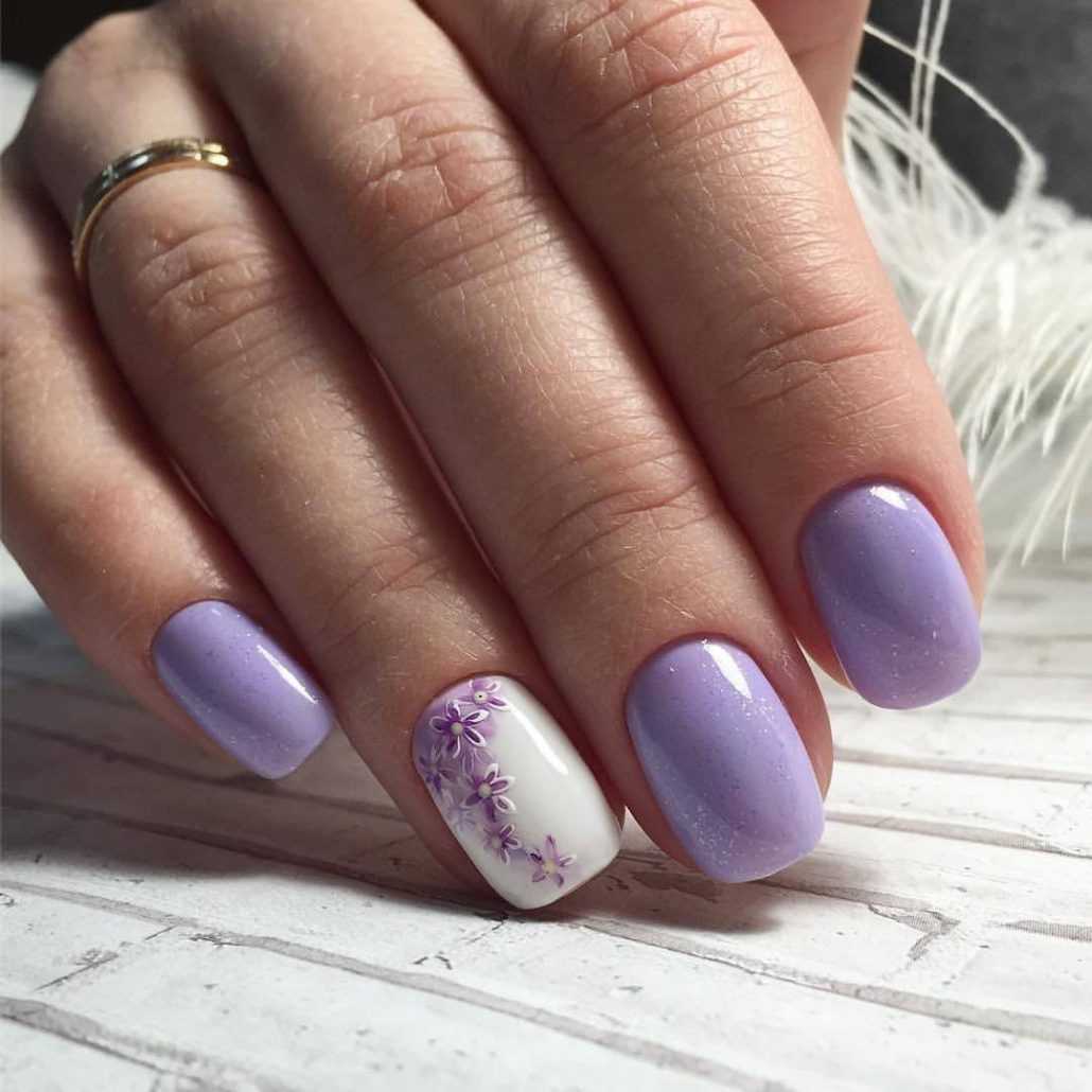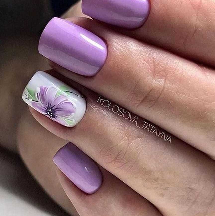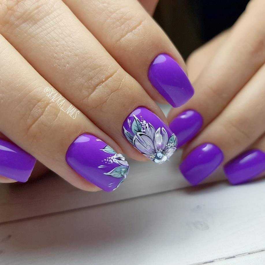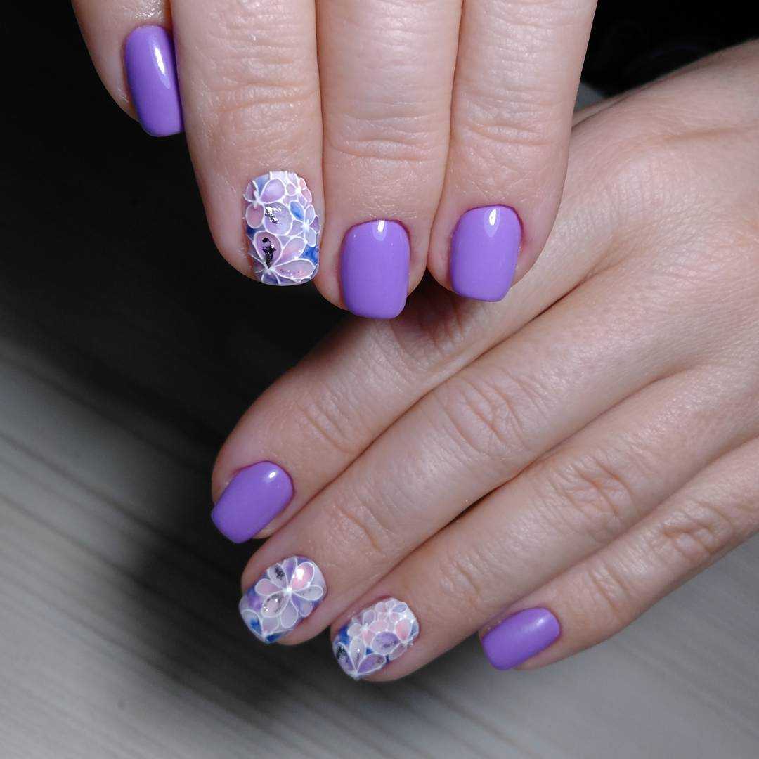 Мигольды короткой длины совсем не помеха для выполнения фиолетового маникюра с цветочным рисунком. Мягкая квадратная, квадратная и овальная форма утонченно смотрятся с цветами, бутонами и веточками. Это может быть глянцевое или матовое покрытие, неброские или насыщенные оттенки цветочных узоров, а также штрихи нежной росписи или яркие узоры. На короткой длине ногтей будет уместен любой дизайн маникюра с цветами. Сюда тонко впишется даже нейл-арт с лепкой, но следует учитывать, что такие элементы не должны быть слишком большими.
