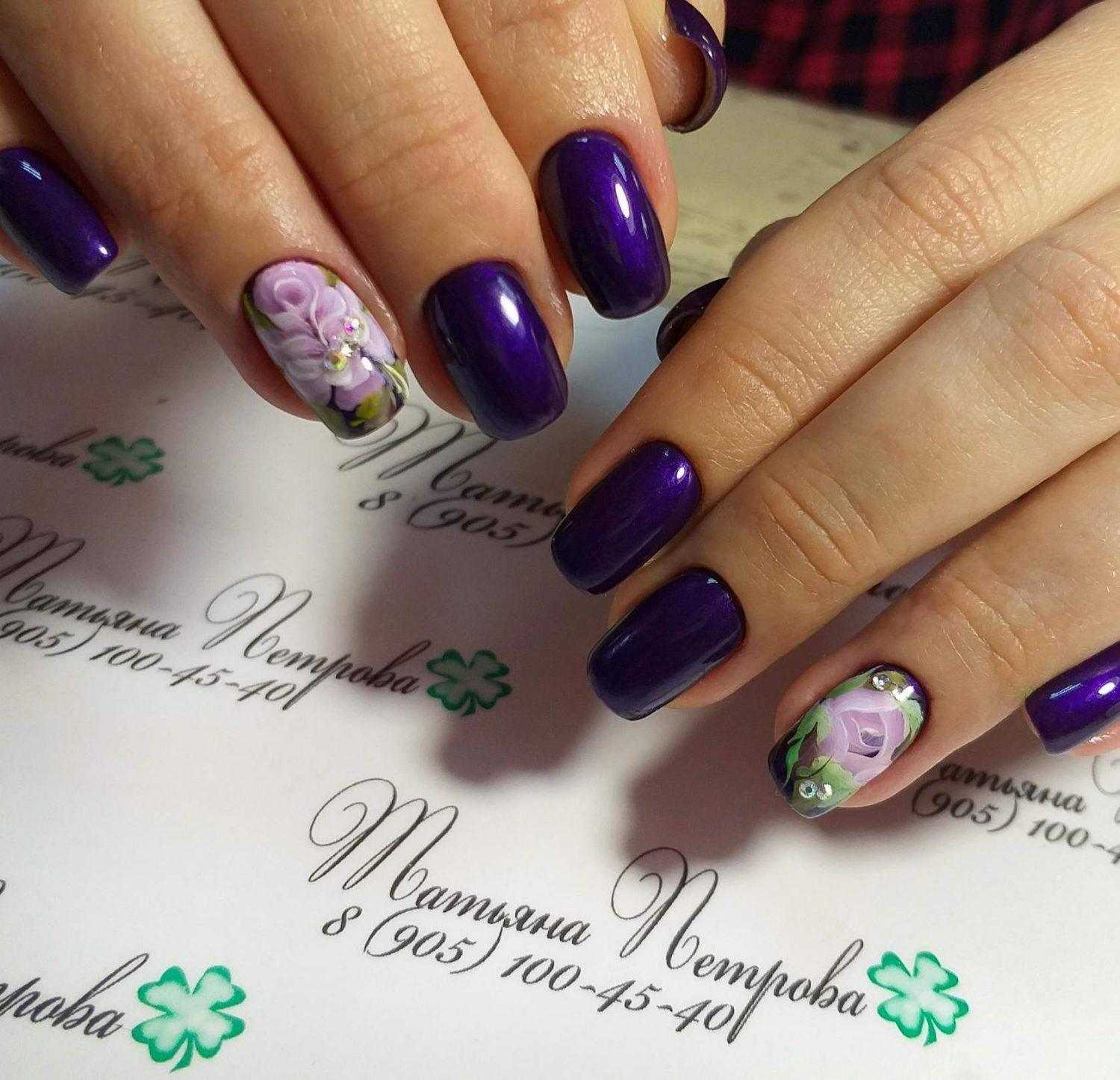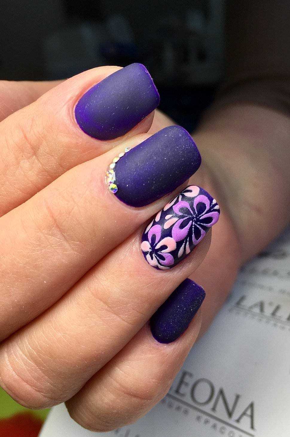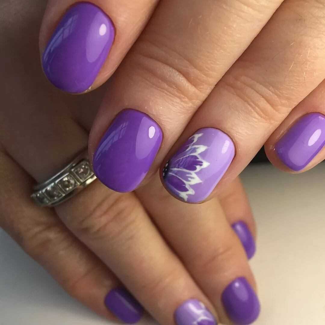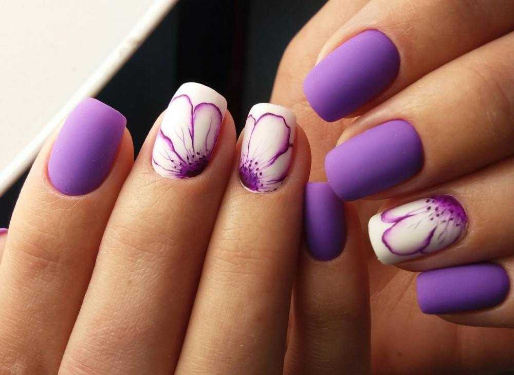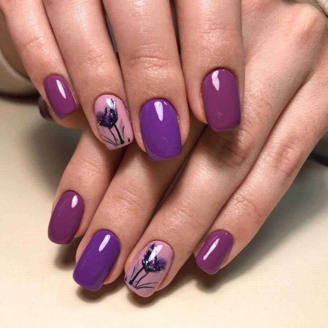 Мигольды короткой длины совсем не помеха для выполнения фиолетового маникюра с цветочным рисунком. Мягкая квадратная, квадратная и овальная форма утонченно смотрятся с цветами, бутонами и веточками. Это может быть глянцевое или матовое покрытие, неброские или насыщенные оттенки цветочных узоров, а также штрихи нежной росписи или яркие узоры. На короткой длине ногтей будет уместен любой дизайн маникюра с цветами. Сюда тонко впишется даже нейл-арт с лепкой, но следует учитывать, что такие элементы не должны быть слишком большими.