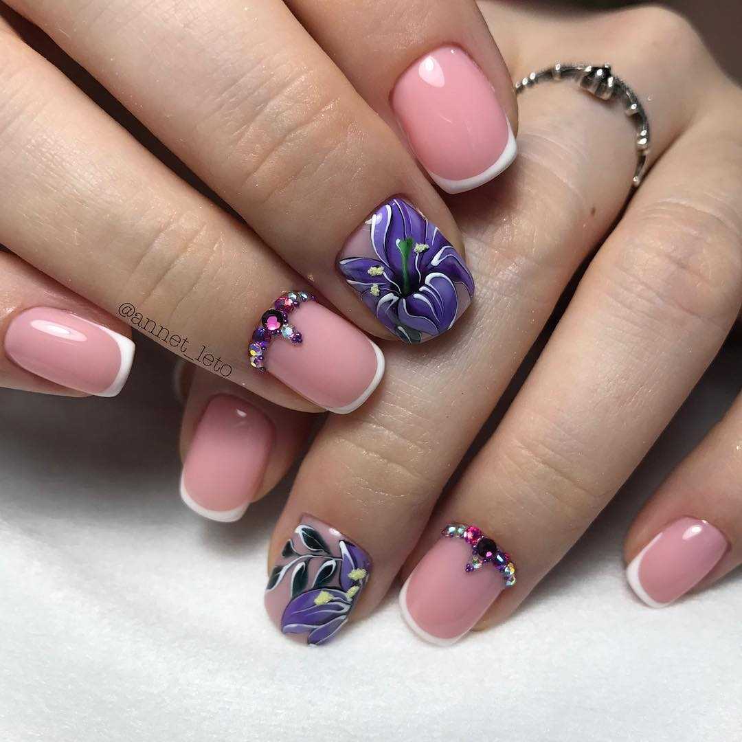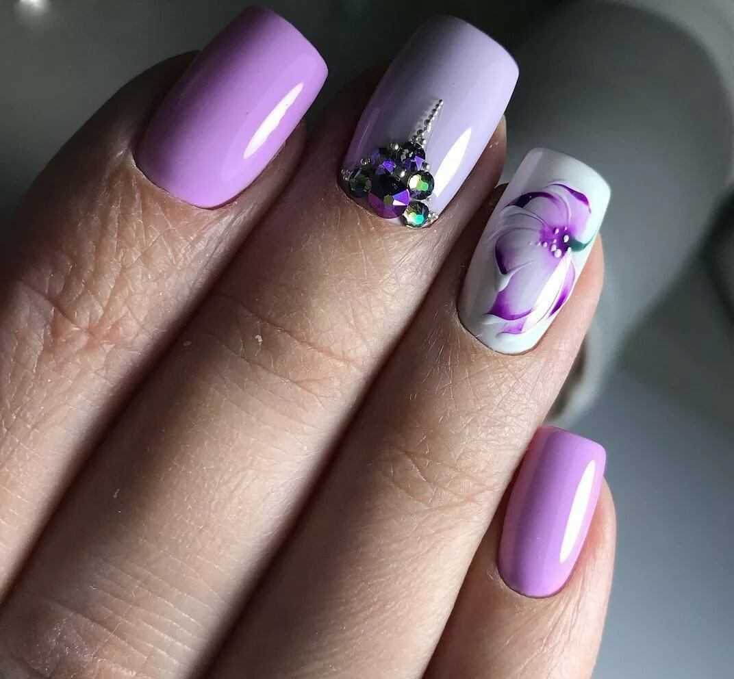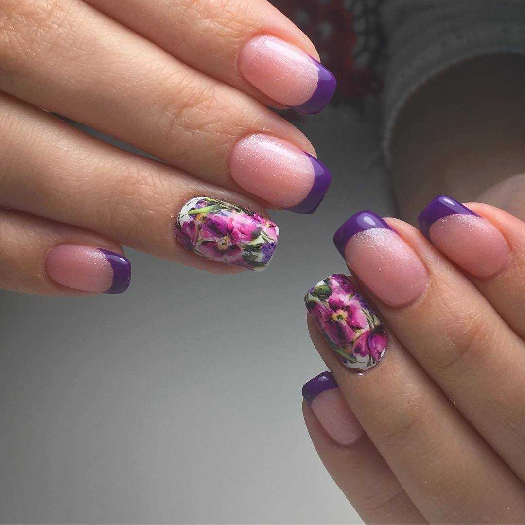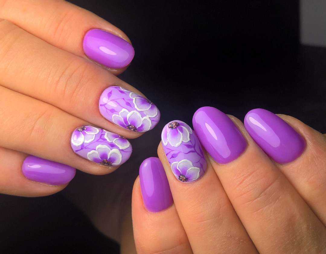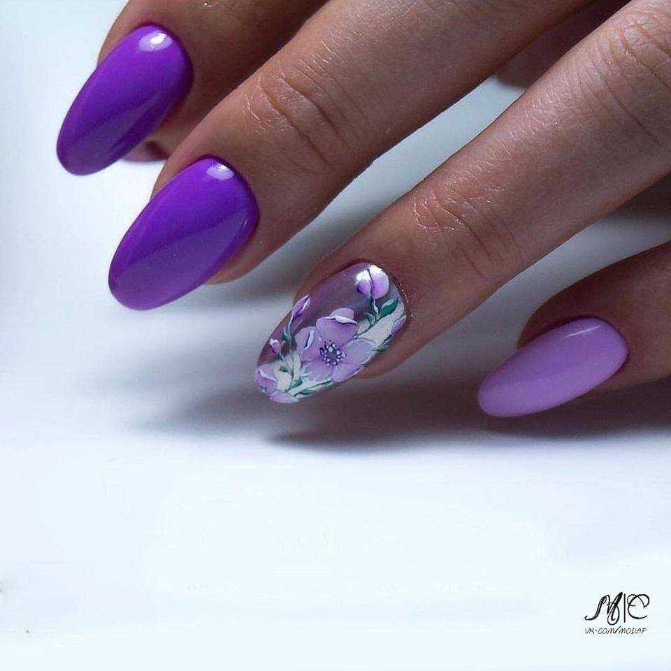 Мигольды короткой длины совсем не помеха для выполнения фиолетового маникюра с цветочным рисунком. Мягкая квадратная, квадратная и овальная форма утонченно смотрятся с цветами, бутонами и веточками. Это может быть глянцевое или матовое покрытие, неброские или насыщенные оттенки цветочных узоров, а также штрихи нежной росписи или яркие узоры. На короткой длине ногтей будет уместен любой дизайн маникюра с цветами. Сюда тонко впишется даже нейл-арт с лепкой, но следует учитывать, что такие элементы не должны быть слишком большими.