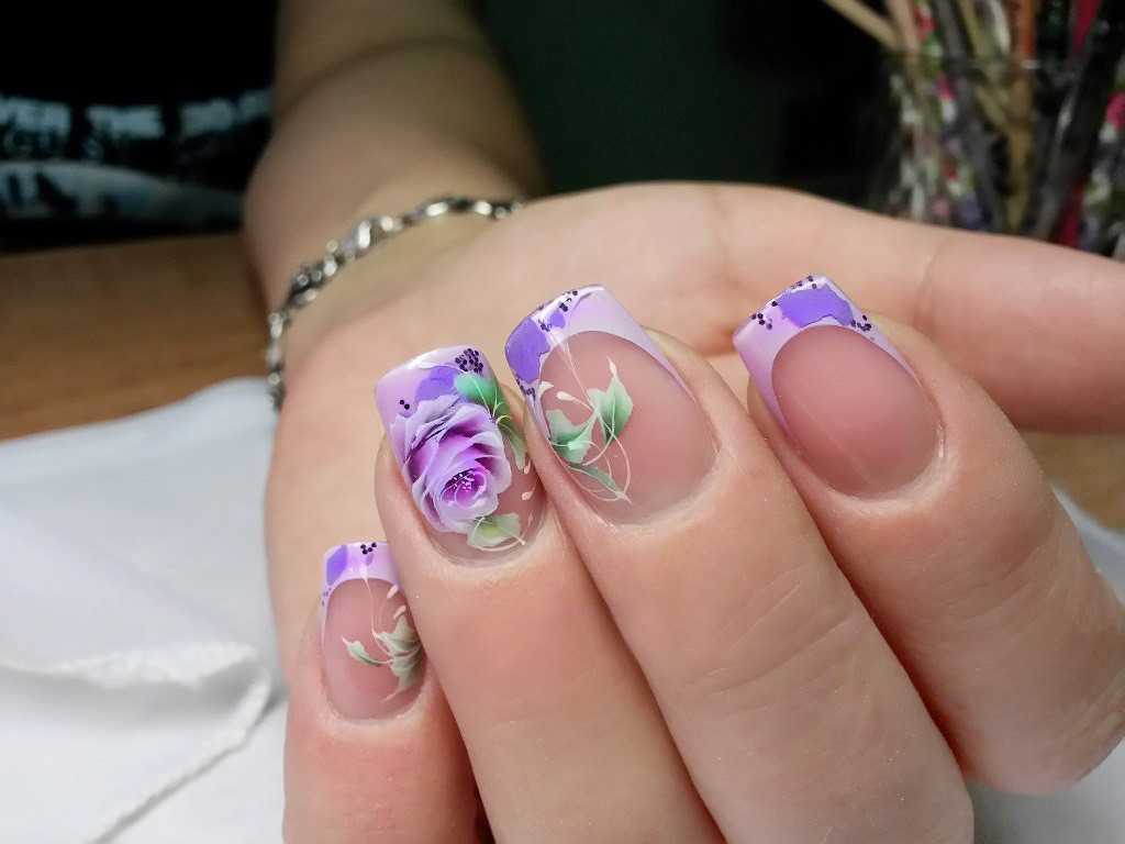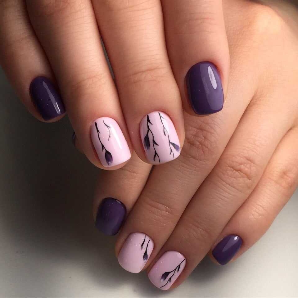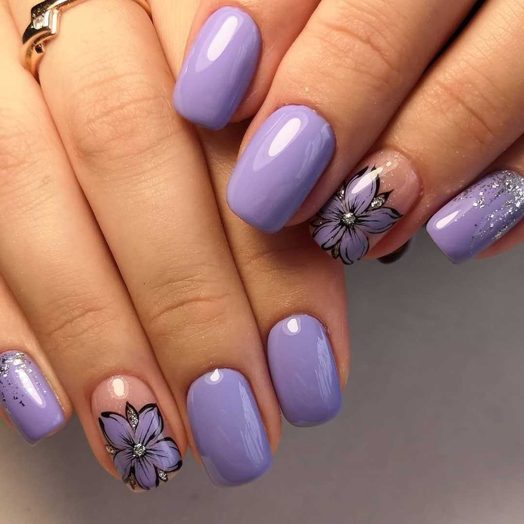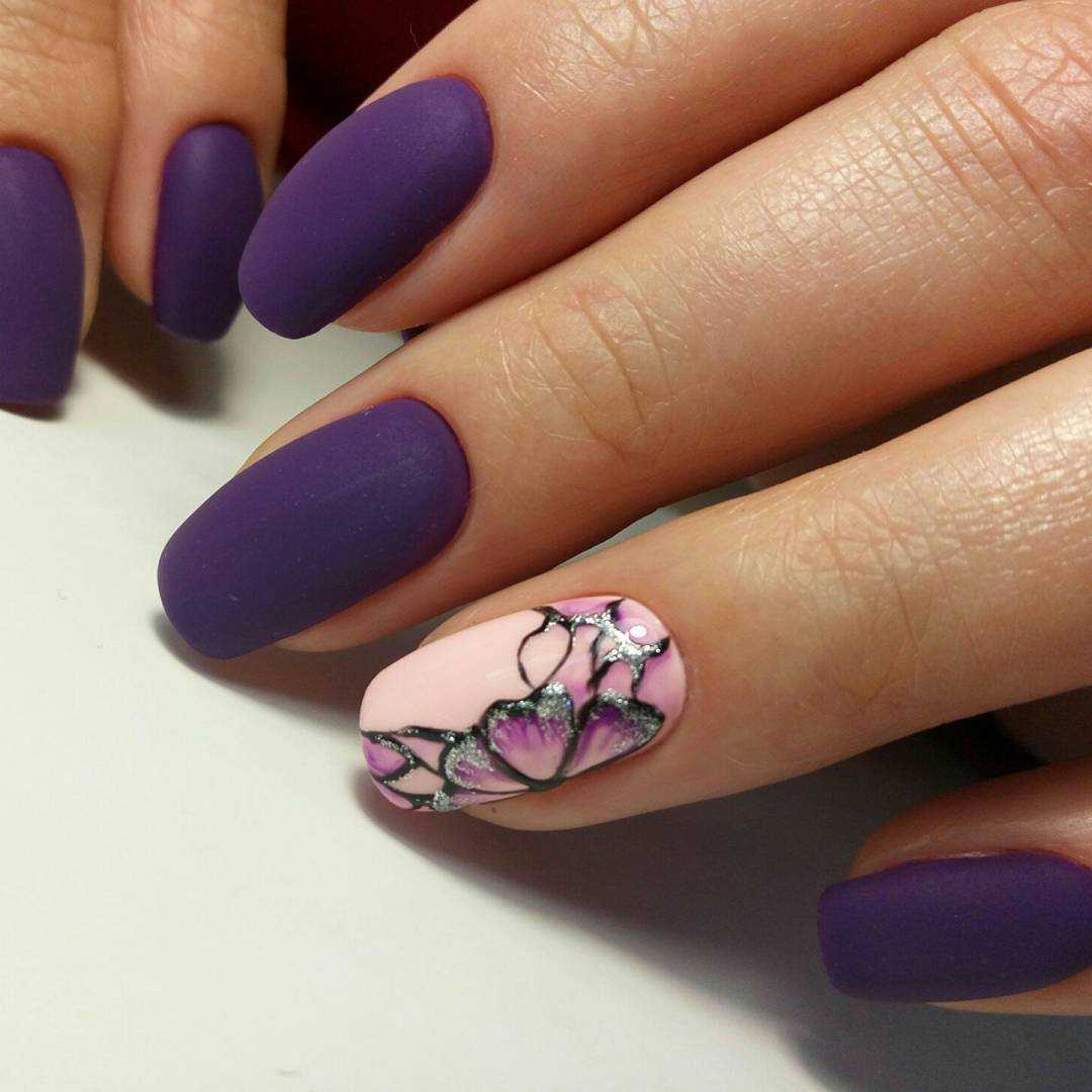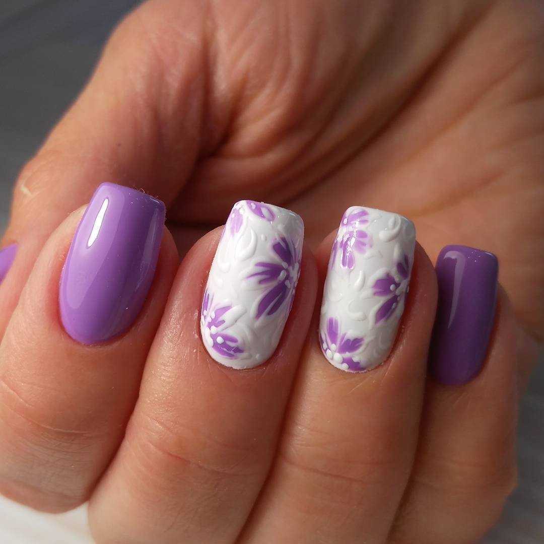 Мигольды короткой длины совсем не помеха для выполнения фиолетового маникюра с цветочным рисунком. Мягкая квадратная, квадратная и овальная форма утонченно смотрятся с цветами, бутонами и веточками. Это может быть глянцевое или матовое покрытие, неброские или насыщенные оттенки цветочных узоров, а также штрихи нежной росписи или яркие узоры. На короткой длине ногтей будет уместен любой дизайн маникюра с цветами. Сюда тонко впишется даже нейл-арт с лепкой, но следует учитывать, что такие элементы не должны быть слишком большими.