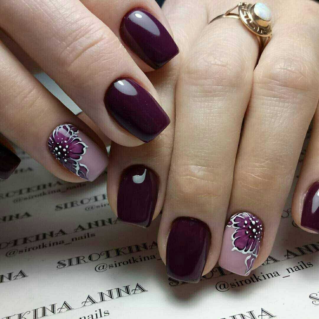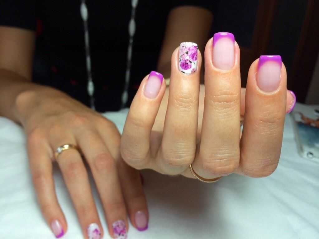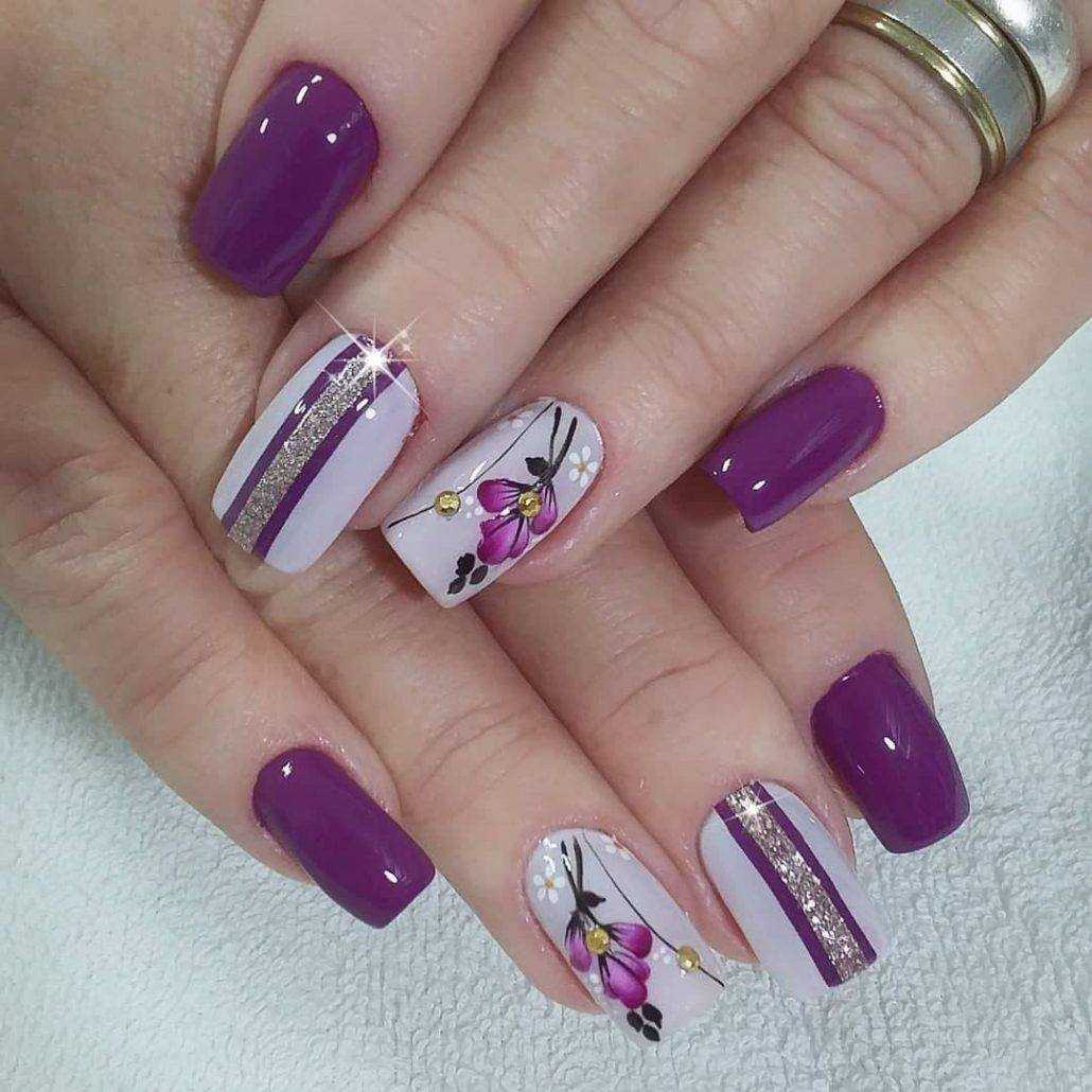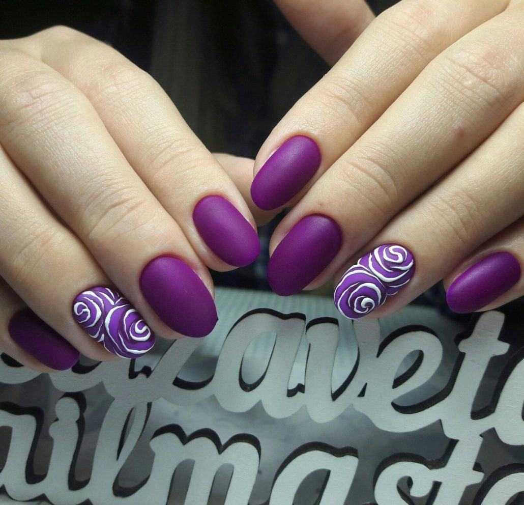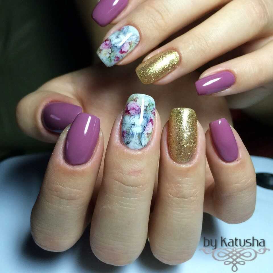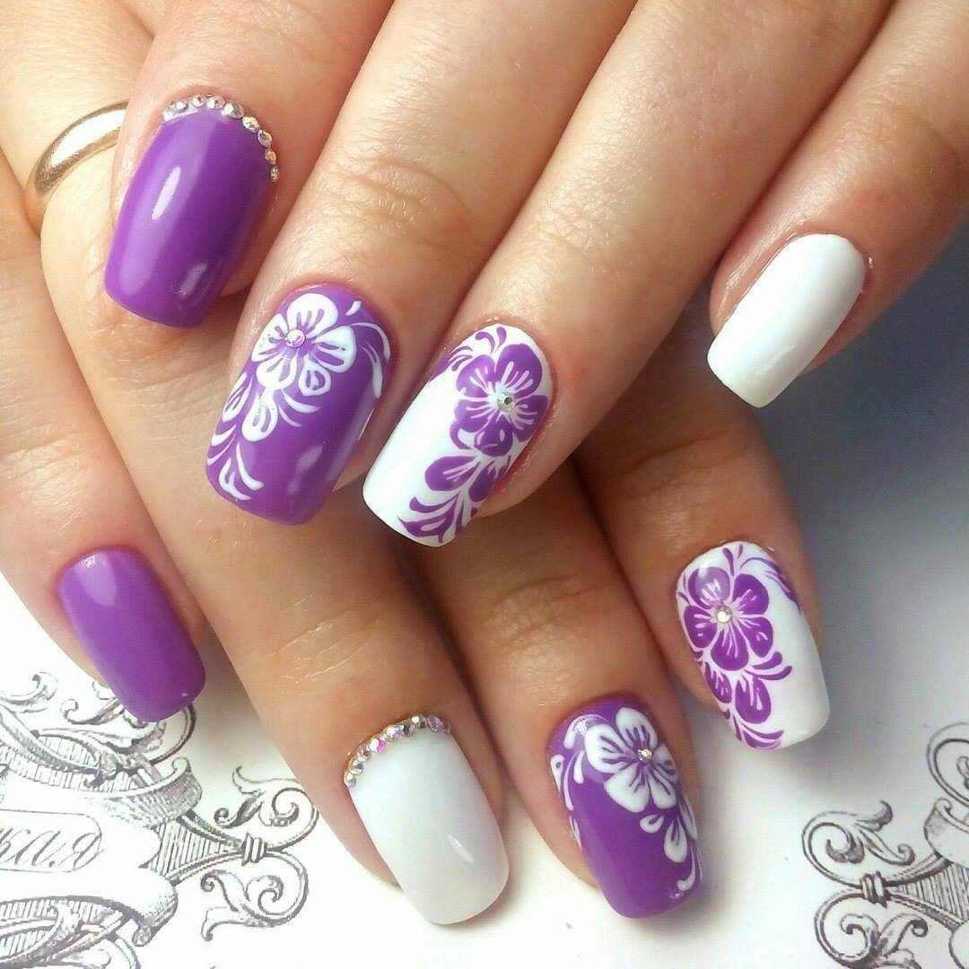 Мигольды короткой длины совсем не помеха для выполнения фиолетового маникюра с цветочным рисунком. Мягкая квадратная, квадратная и овальная форма утонченно смотрятся с цветами, бутонами и веточками. Это может быть глянцевое или матовое покрытие, неброские или насыщенные оттенки цветочных узоров, а также штрихи нежной росписи или яркие узоры. На короткой длине ногтей будет уместен любой дизайн маникюра с цветами. Сюда тонко впишется даже нейл-арт с лепкой, но следует учитывать, что такие элементы не должны быть слишком большими.