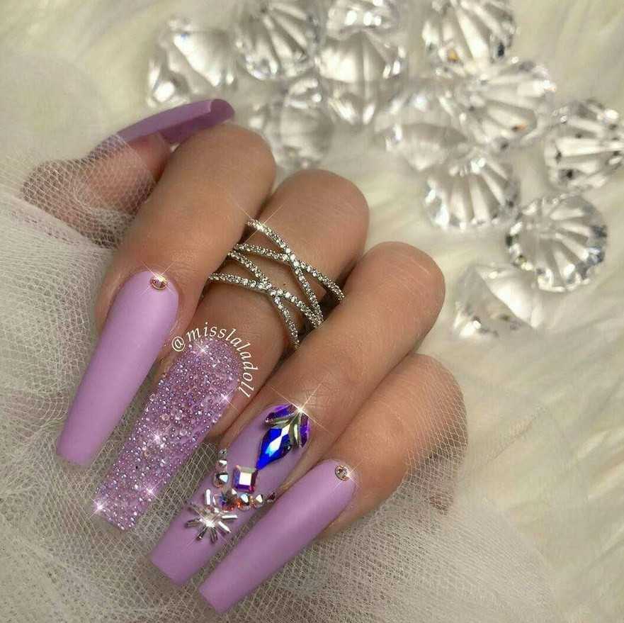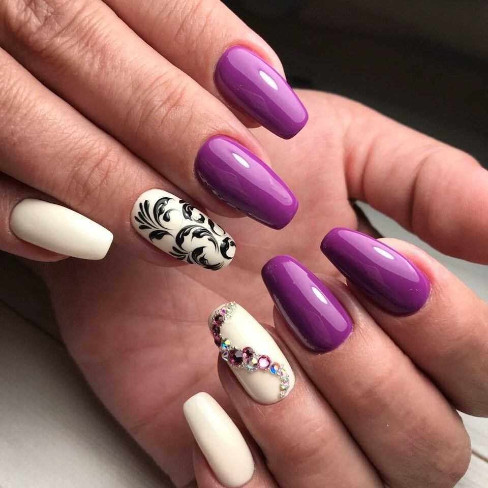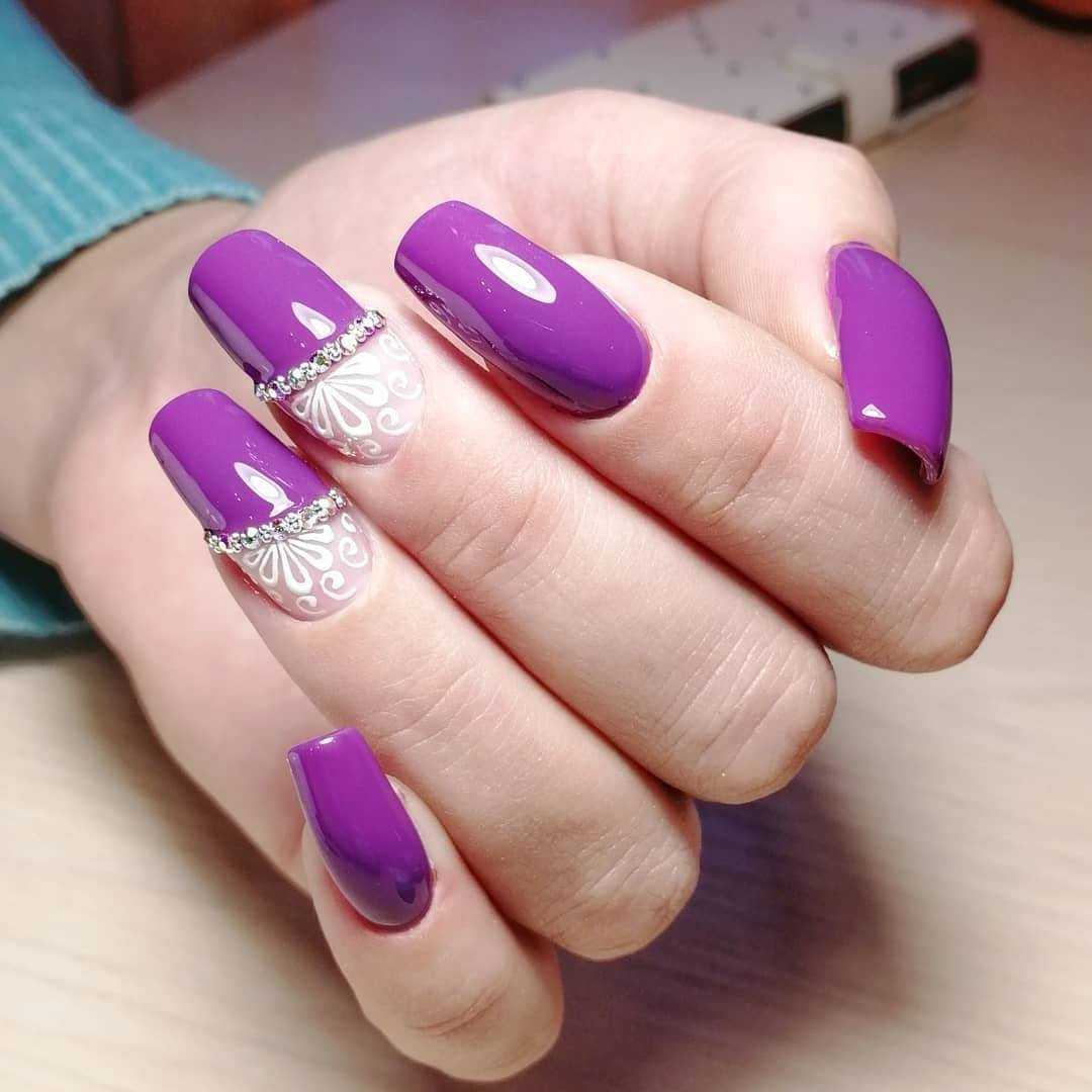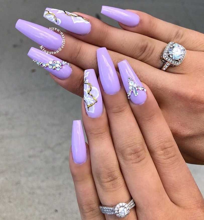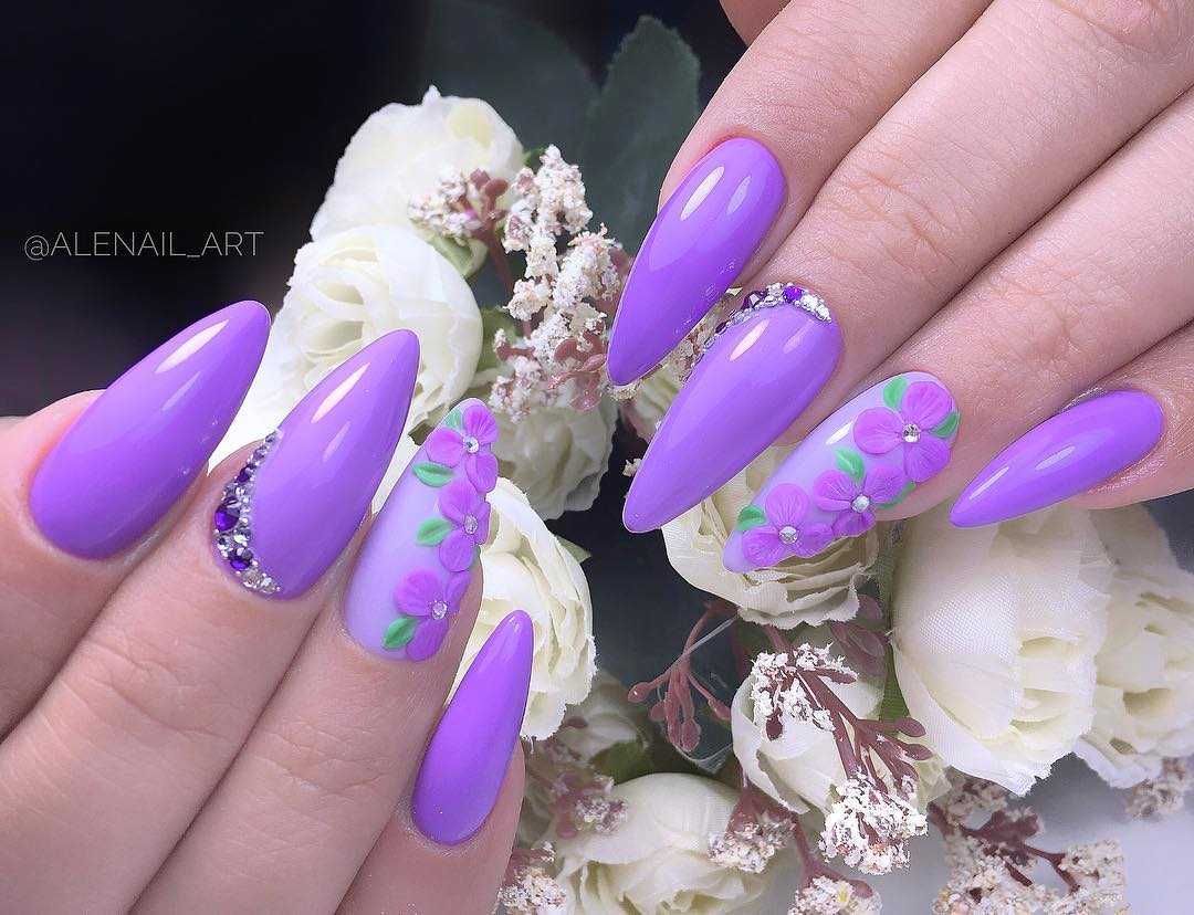 Длинные ногти и фиолетовый маникюр – нескончаемое поле для экспериментов нейл-арта, поэтому не бойся пробовать рисунки, стразы и разные техники оформления.