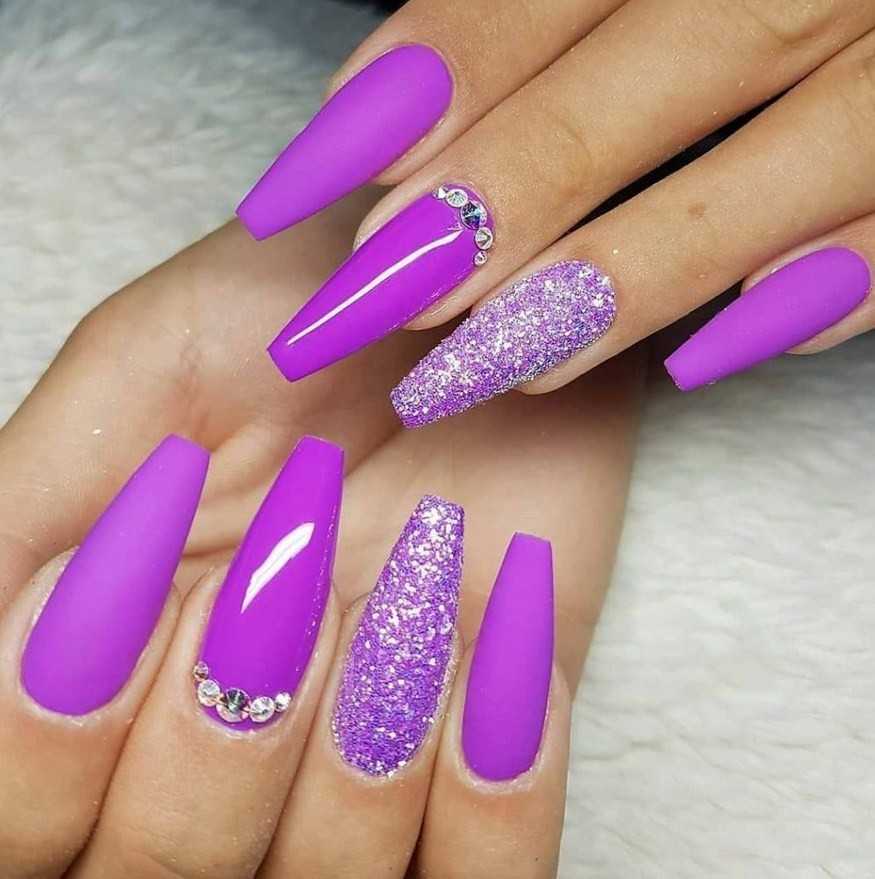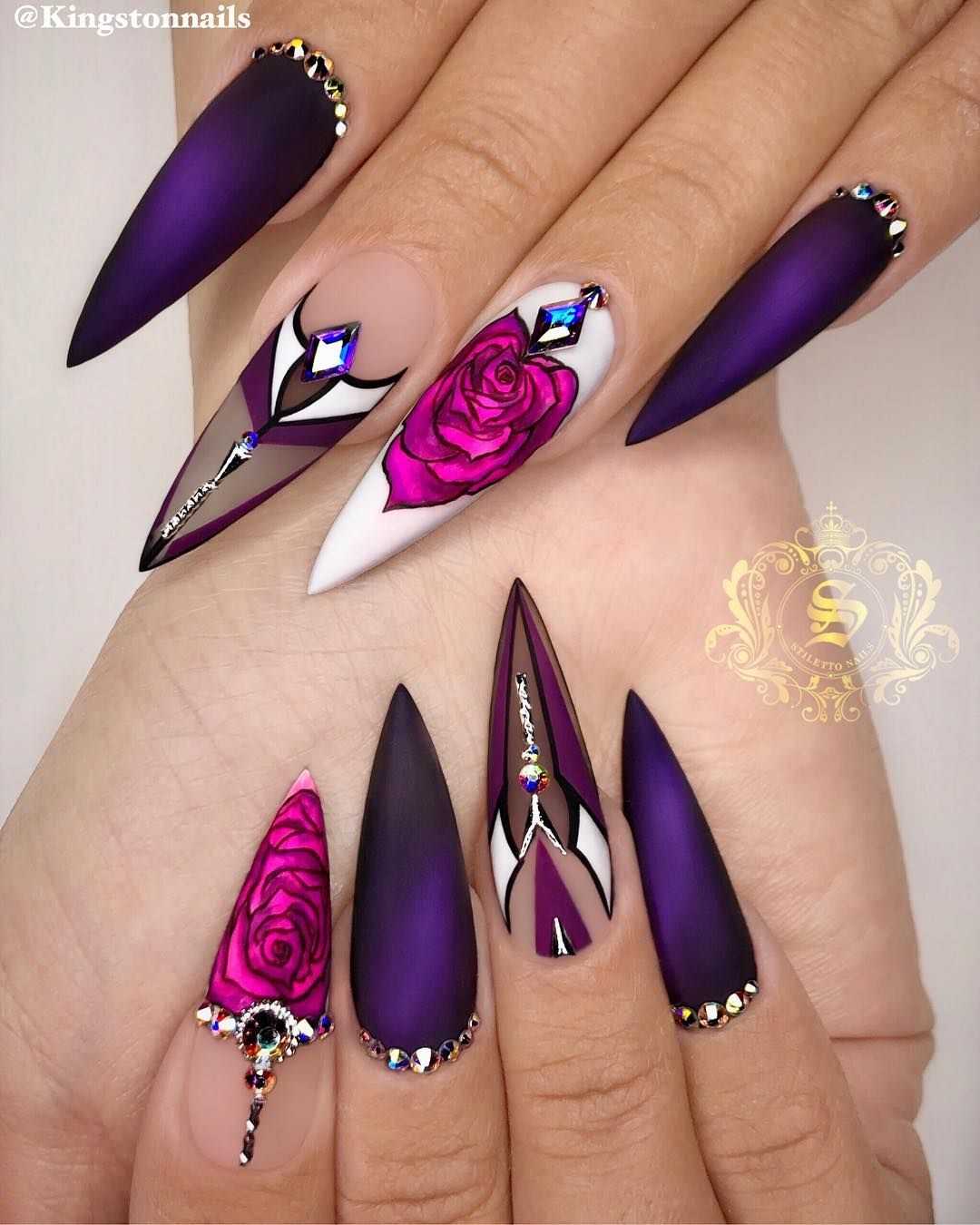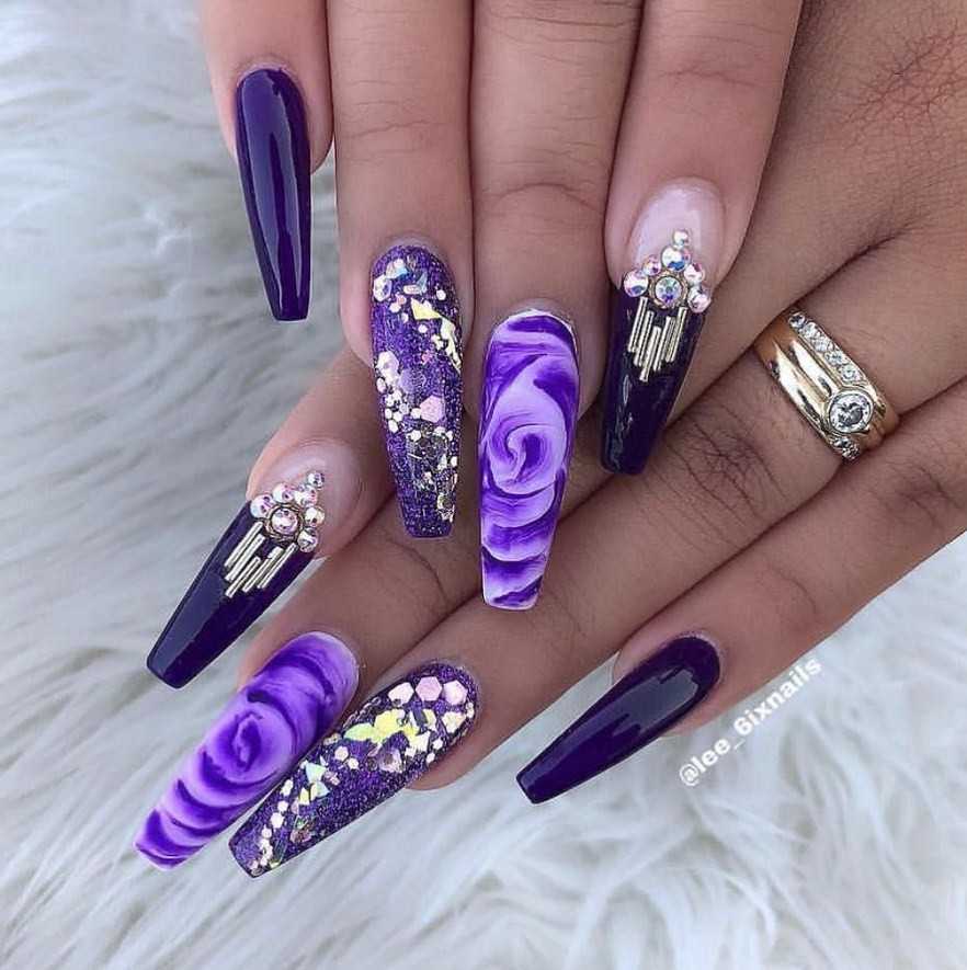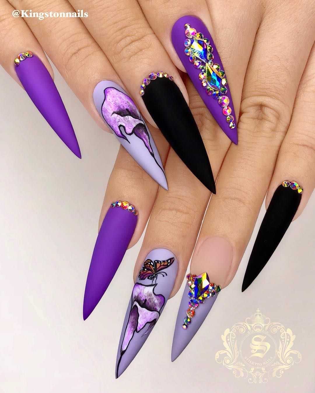 Длинные ногти и фиолетовый маникюр – нескончаемое поле для экспериментов нейл-арта, поэтому не бойся пробовать рисунки, стразы и разные техники оформления.