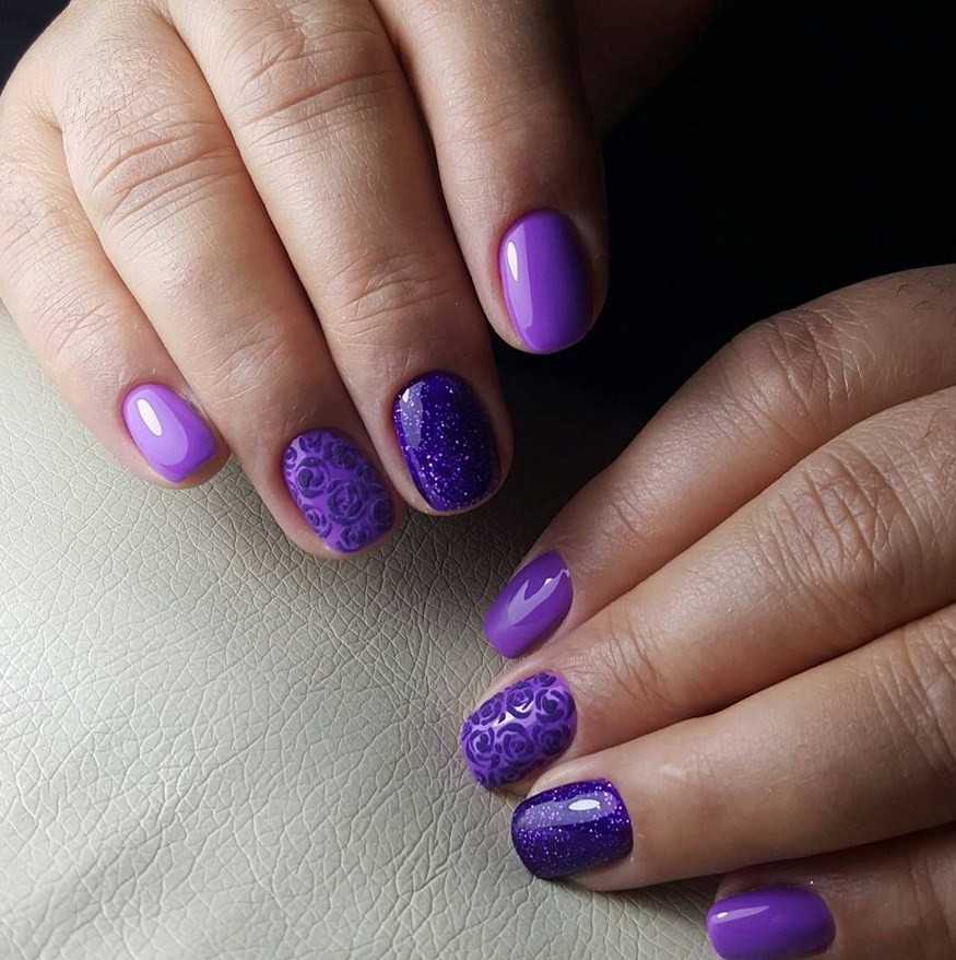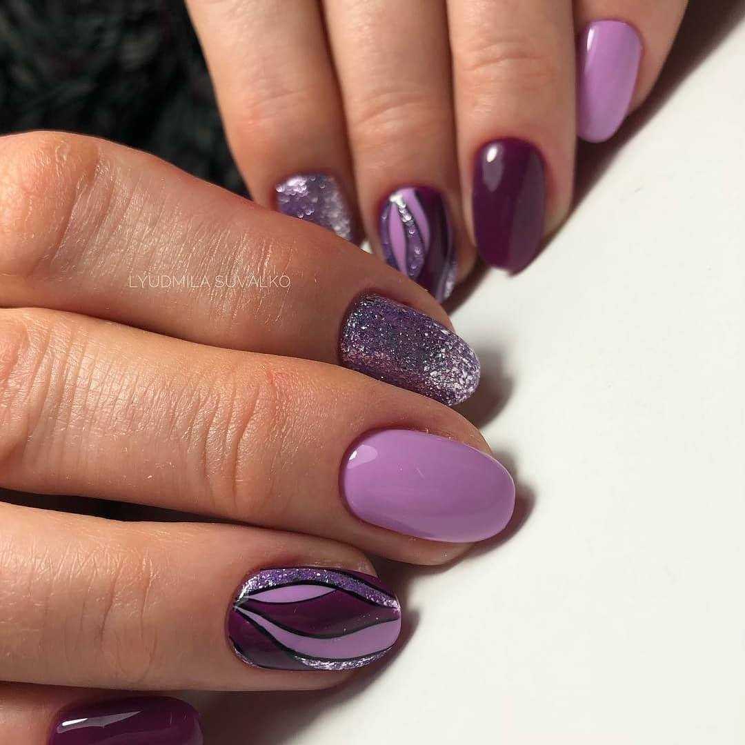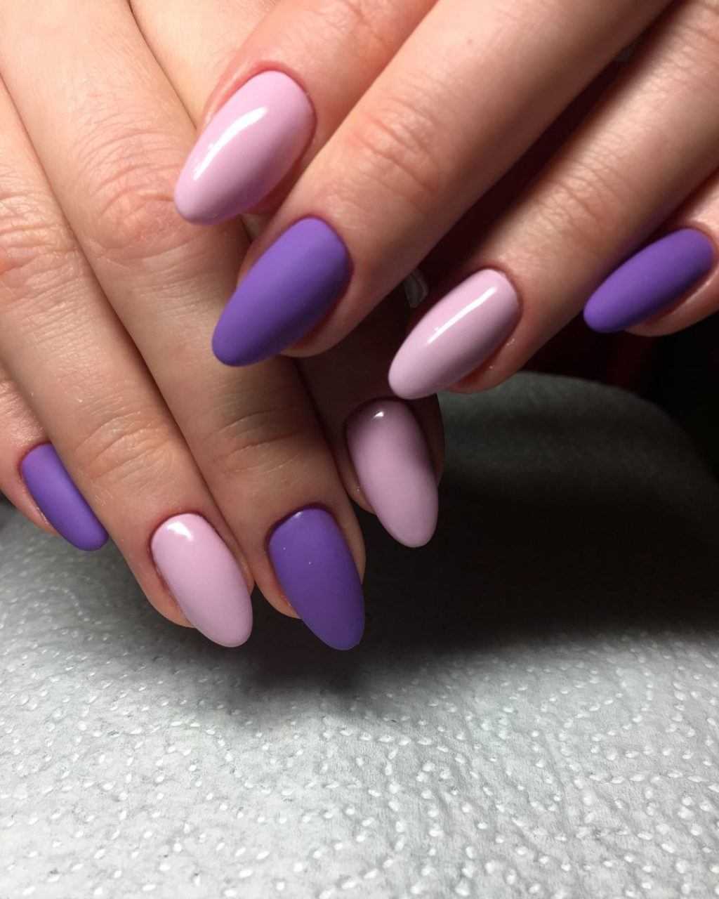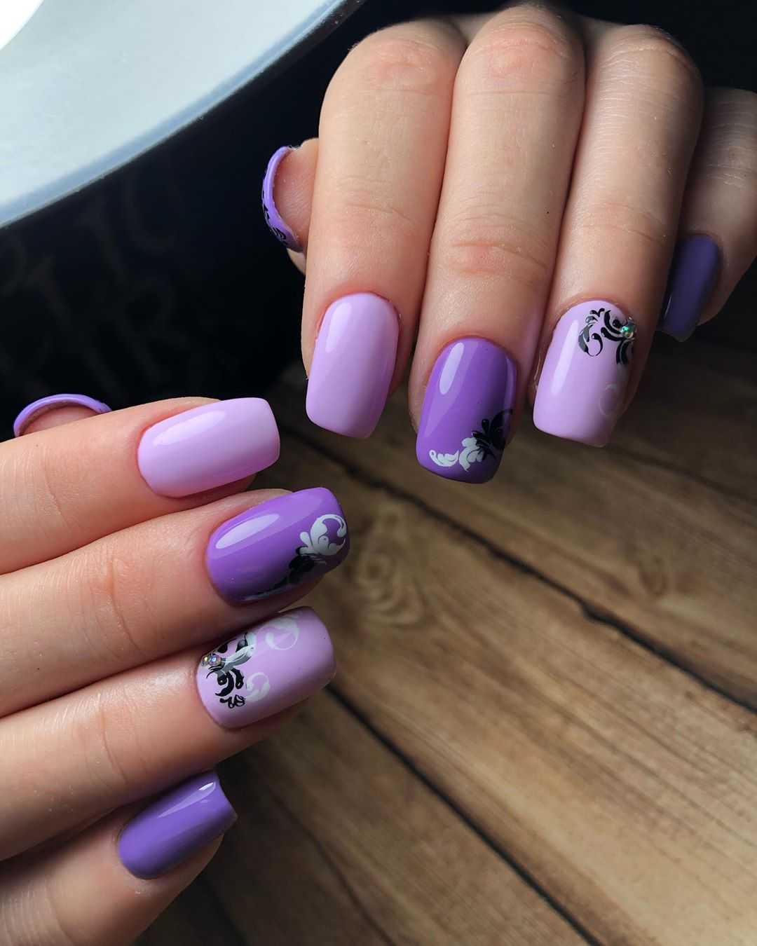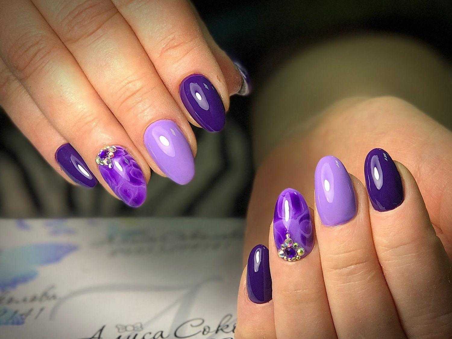 Маникюр в фиолетовых тонах – часть пальчиков в нежно-фиолетовом, а другая часть в более темном.